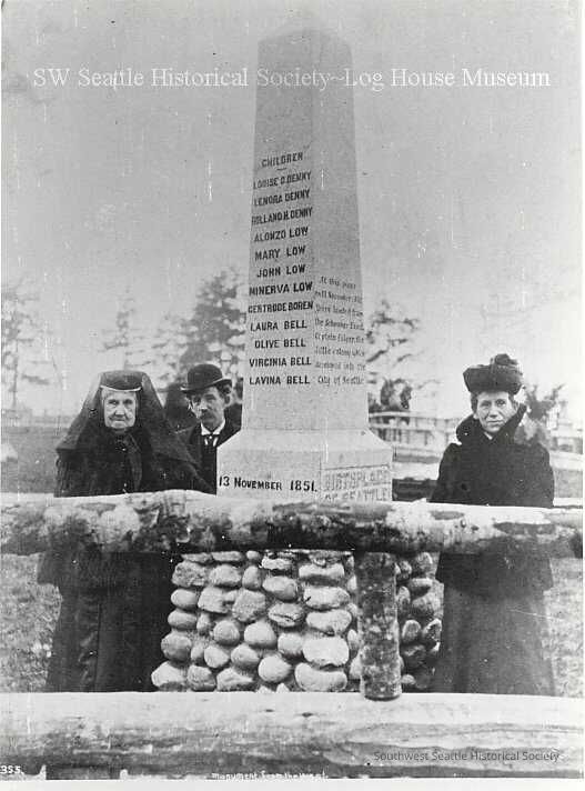 "Birthplace of Seattle" monument with 3 peopleEntry/Object ID