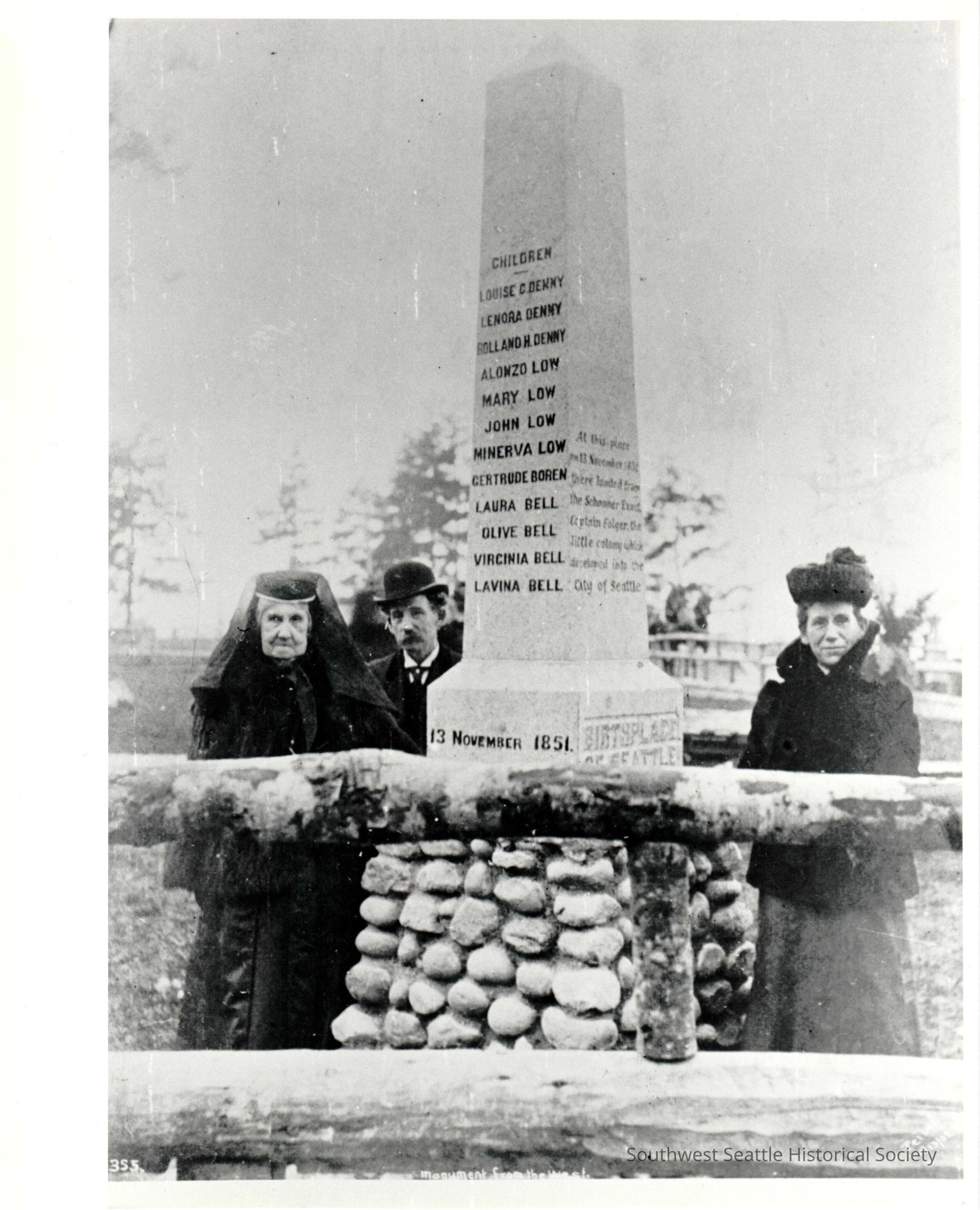 Photo of "Birthplace of Seattle" monument. 3 unidentified people, a woman and a man on the left, and a woman on the right pose with the monument. The man and the woman on the right side of the monument appear to be middle age. The other woman is elderly and wearing a black veil and dress. Written at bottom: "Monument from the west."
