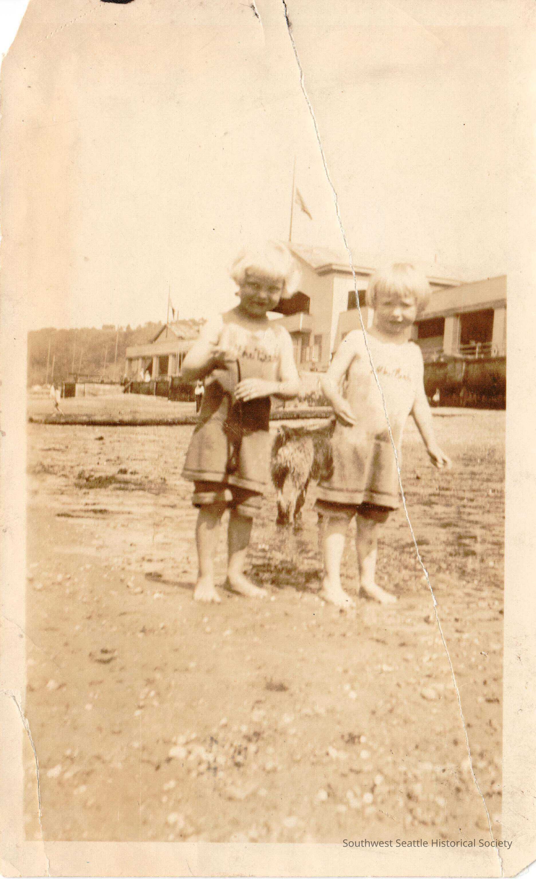 Two children on Alki Beach in bathing suits with dog in background in front of Alki bathhouse. Black and white. Number 48 on back.