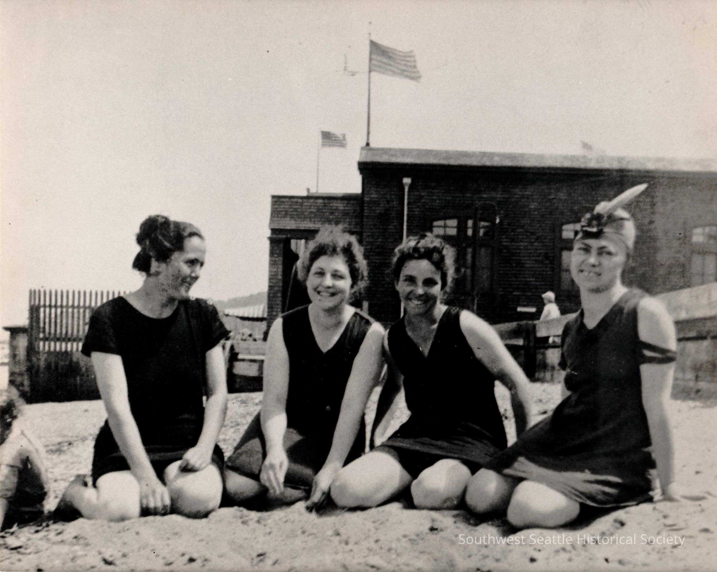 Black and white. 4 female bathers in suits in front of the Alki bathhouse.
