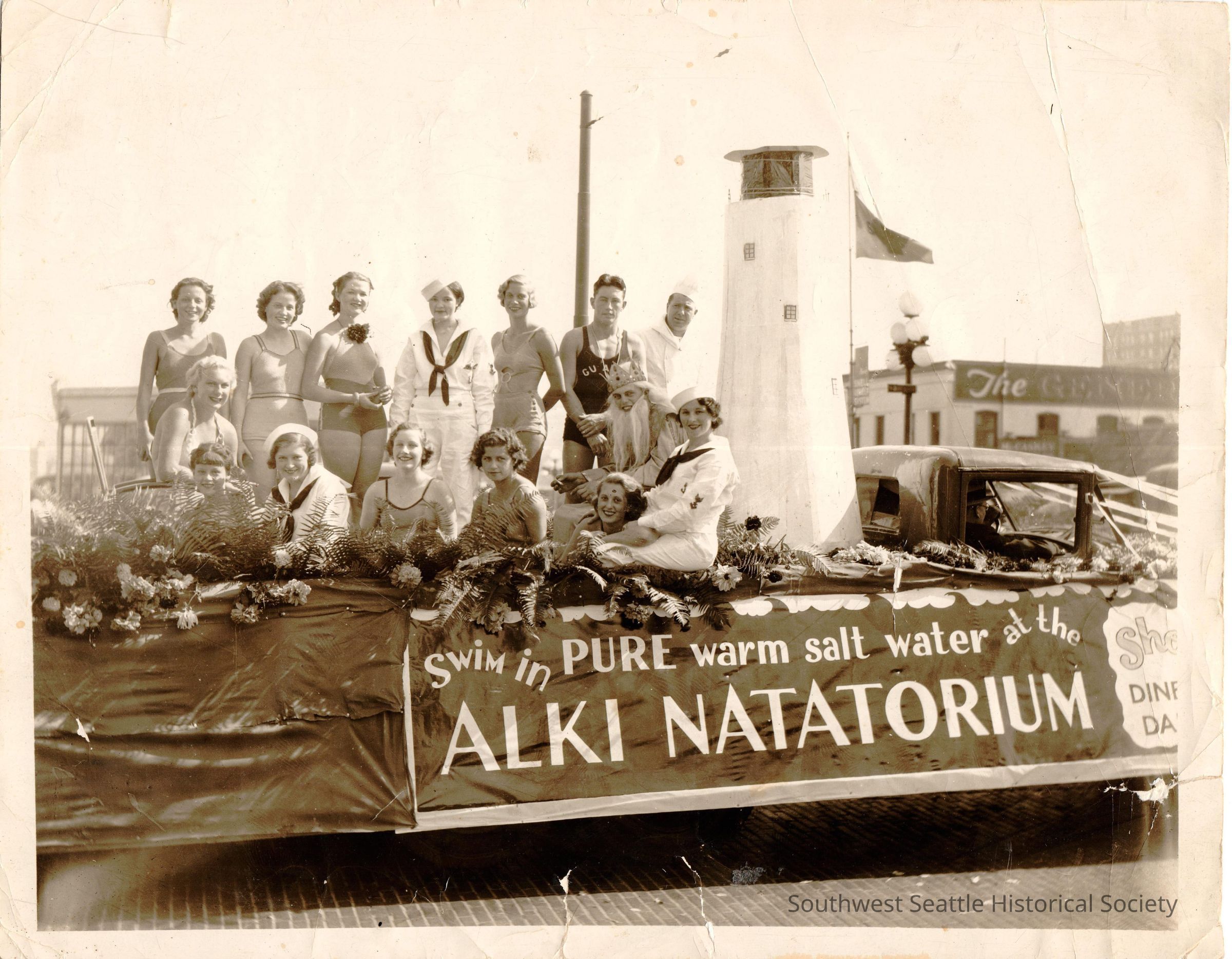 Black and white. Parade photo of Alki Natatorium float with lighthouse, King Neptune, Bathing Beauties, female "sailors" and lifeguard. Sign on photo: "Swim in PURE salt water at the ALKI NATATORIUM".