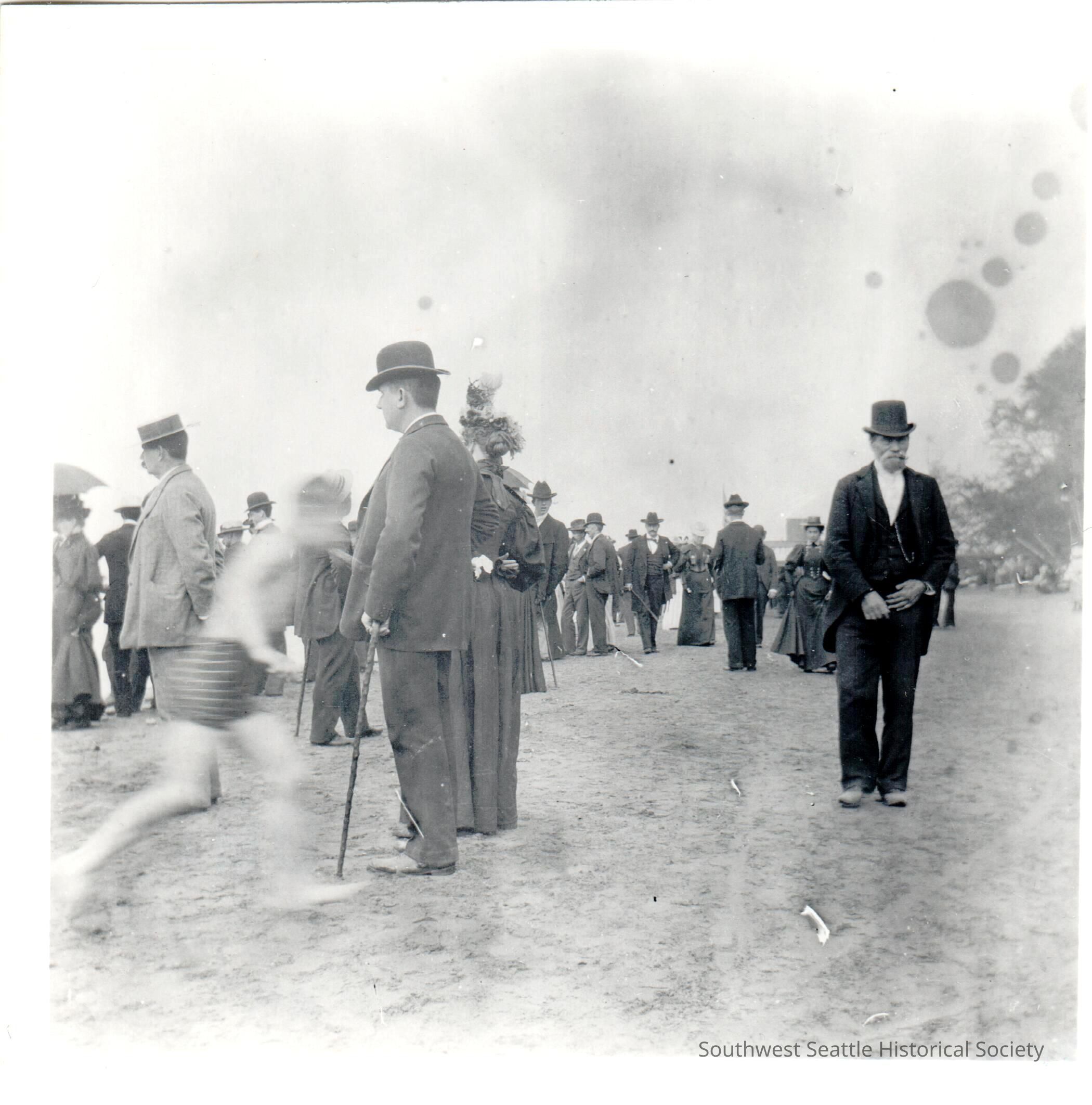 Photograph of a crowd of people dressed in street clothes standing on a beach. A child dressed only in shorts is quickly running through the foreground and is blurred as they are moving quickly.