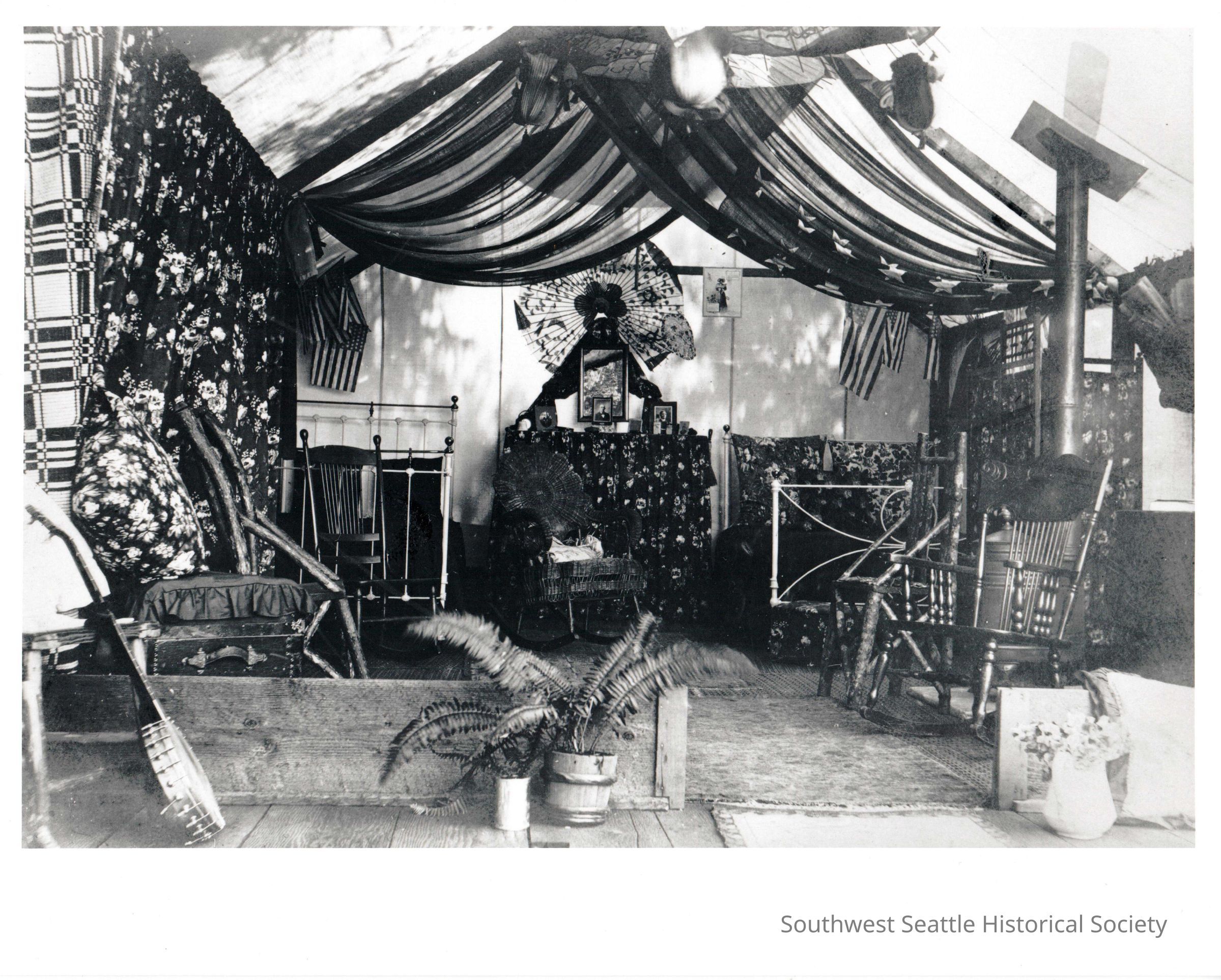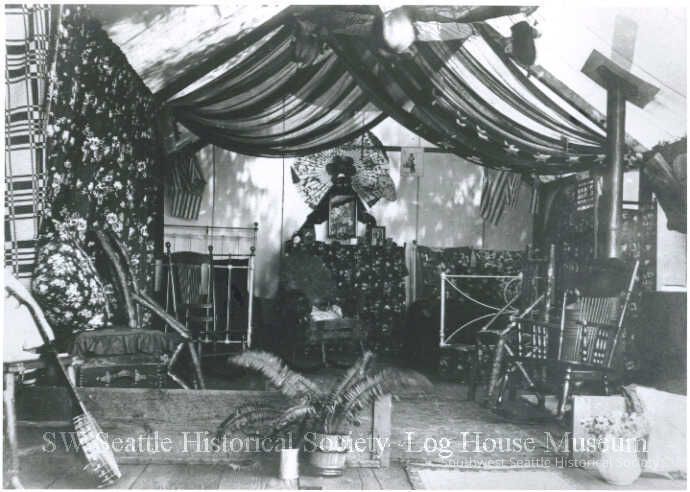 Black and white. Interior of Bernard tent house. Assorted furniture and decorations well visible. Cabinet at back of tent displays photographs. Banjo in foreground.