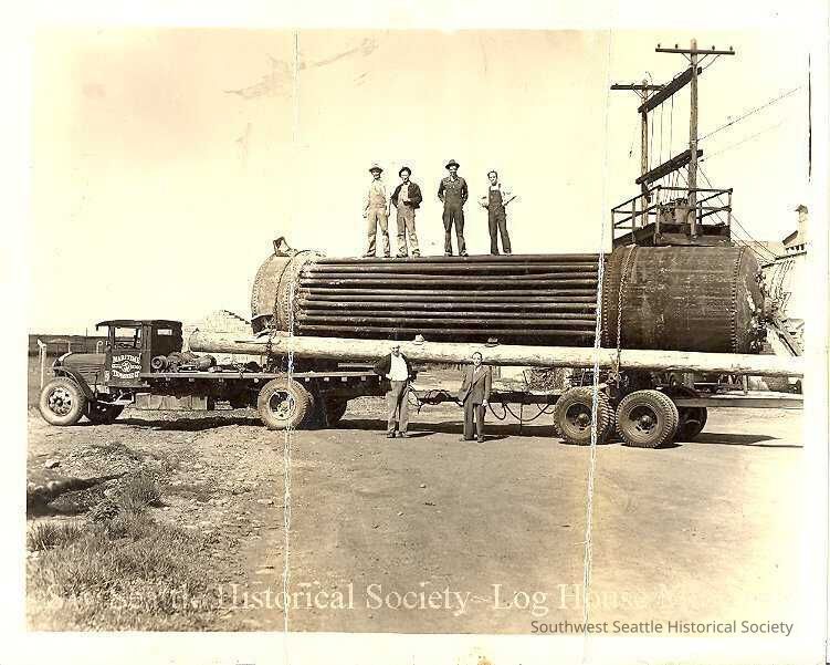 At the brick yard on West Marginal Way owned by Lon Herst, he stands on the right in front of the truck. Glen A. Bailey is the fourth from the left on the truck. Glen is Joan (Mraz) Bailey's father. The truck cab is marked "Maritime Transfer Co".
