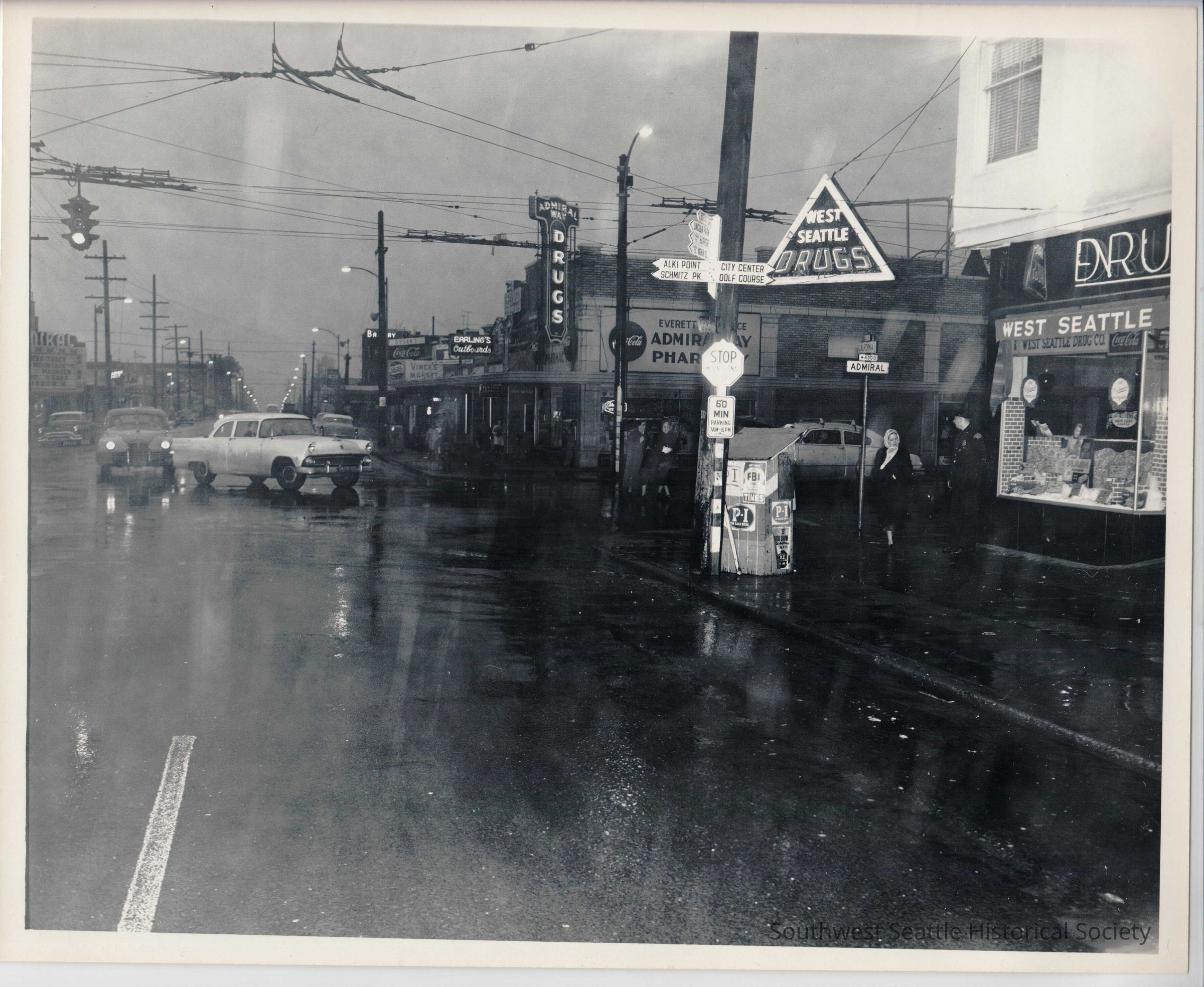 Black and white photo from the Seattle Police Department Crime Lab of the intersection of Admiral and California. Verso: 1809 Jan 16, 1957Made/Created