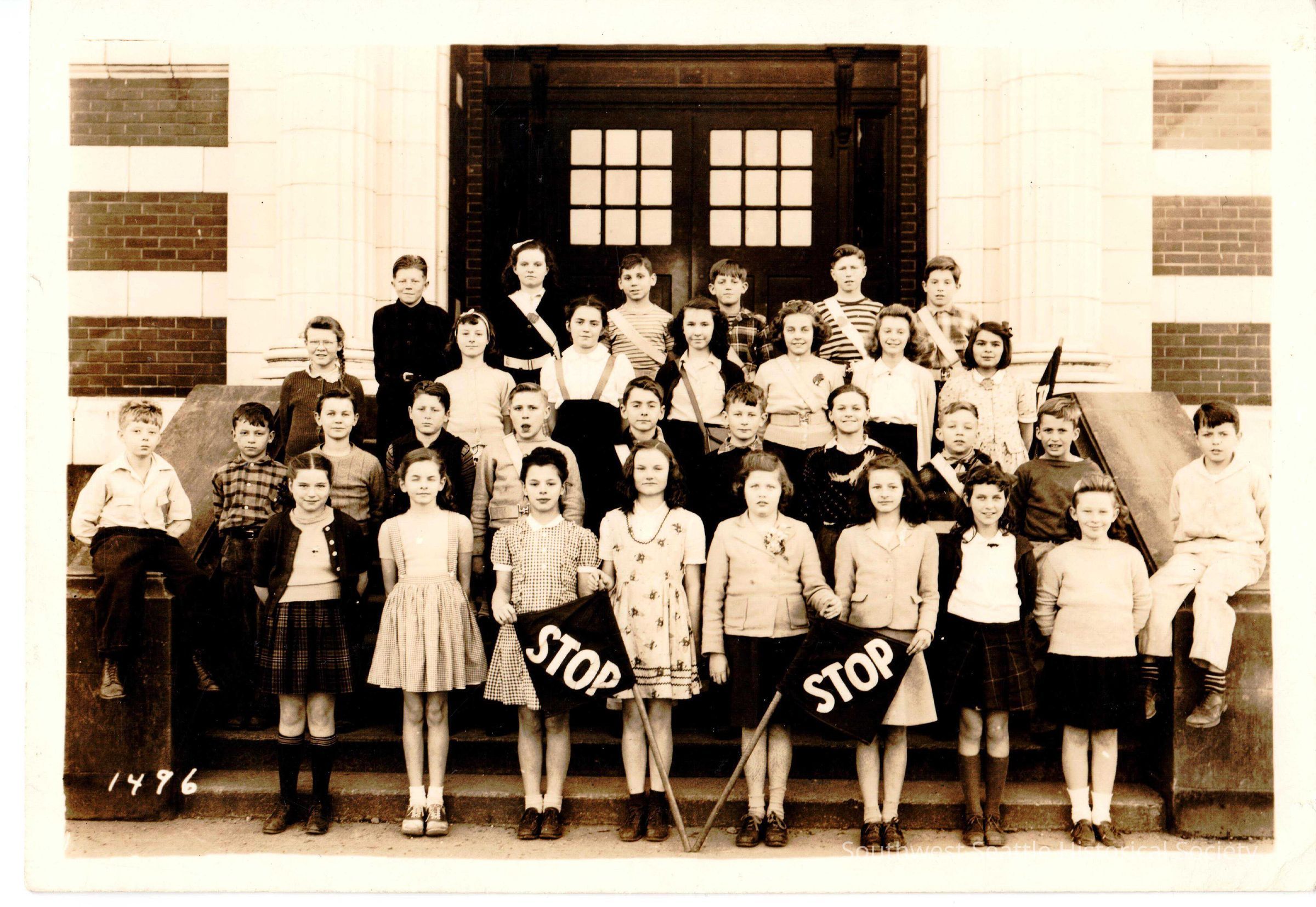 Black and white photograph of a group of kid on steps there are to 'Stop' flag in the front of the photograph