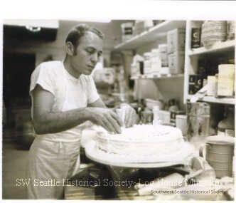 Black and white. Employee at the Admiral Way Bakery working on the first tier of a wedding cake.