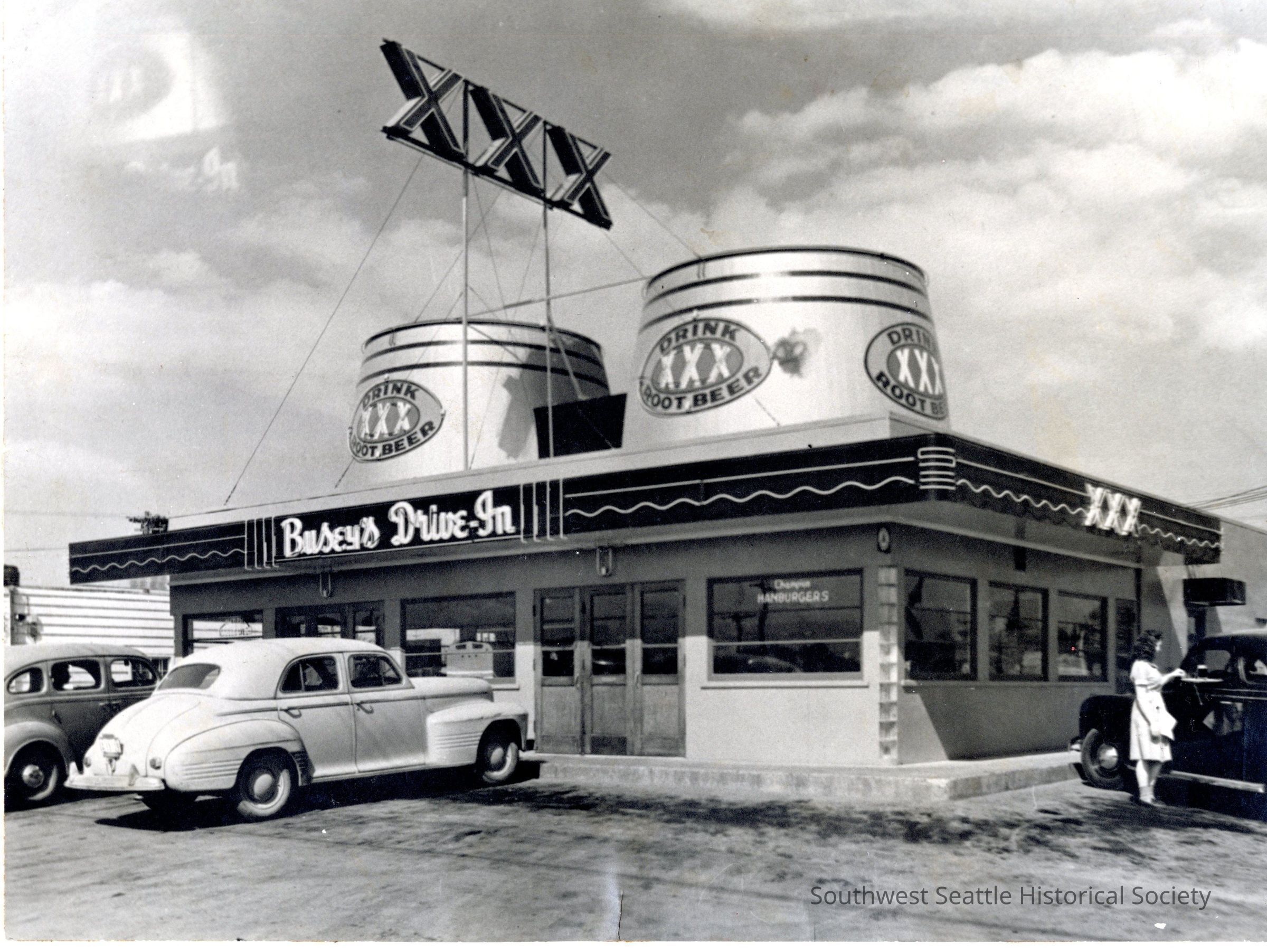 Phot of Busey's XXX Drive In in White Center, at 9808 16th Ave. SW Sold to Marv Musey in 1975 and became Marv's Broiler. Detailed history is in "West Side Story," on page 243.