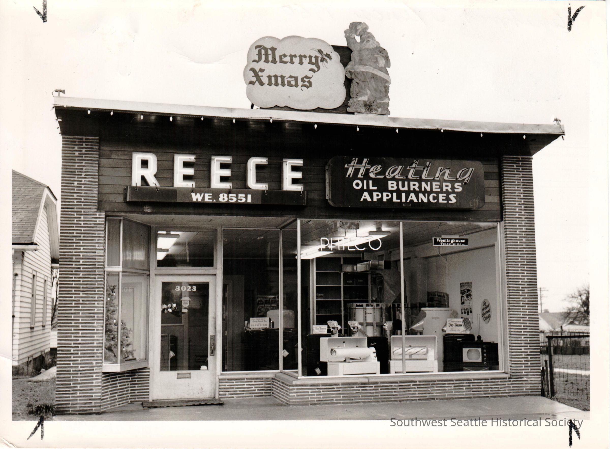 Black and white. Reece Heating at 3023 California Avenue in December 1956. "Merry Xmas" and a santa on top of the store.