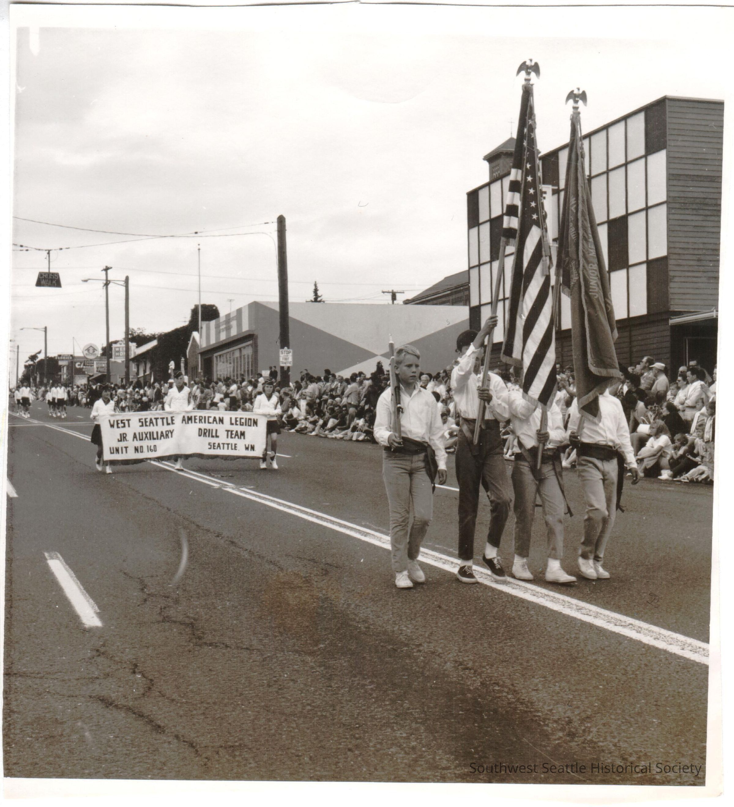 Black and white. Color Guard and the "West Seattle American Legion Jr. Auxiliary Drill Team unit no. 160" marching during the 1966 Hi-Yu parade, by Foe Hall.