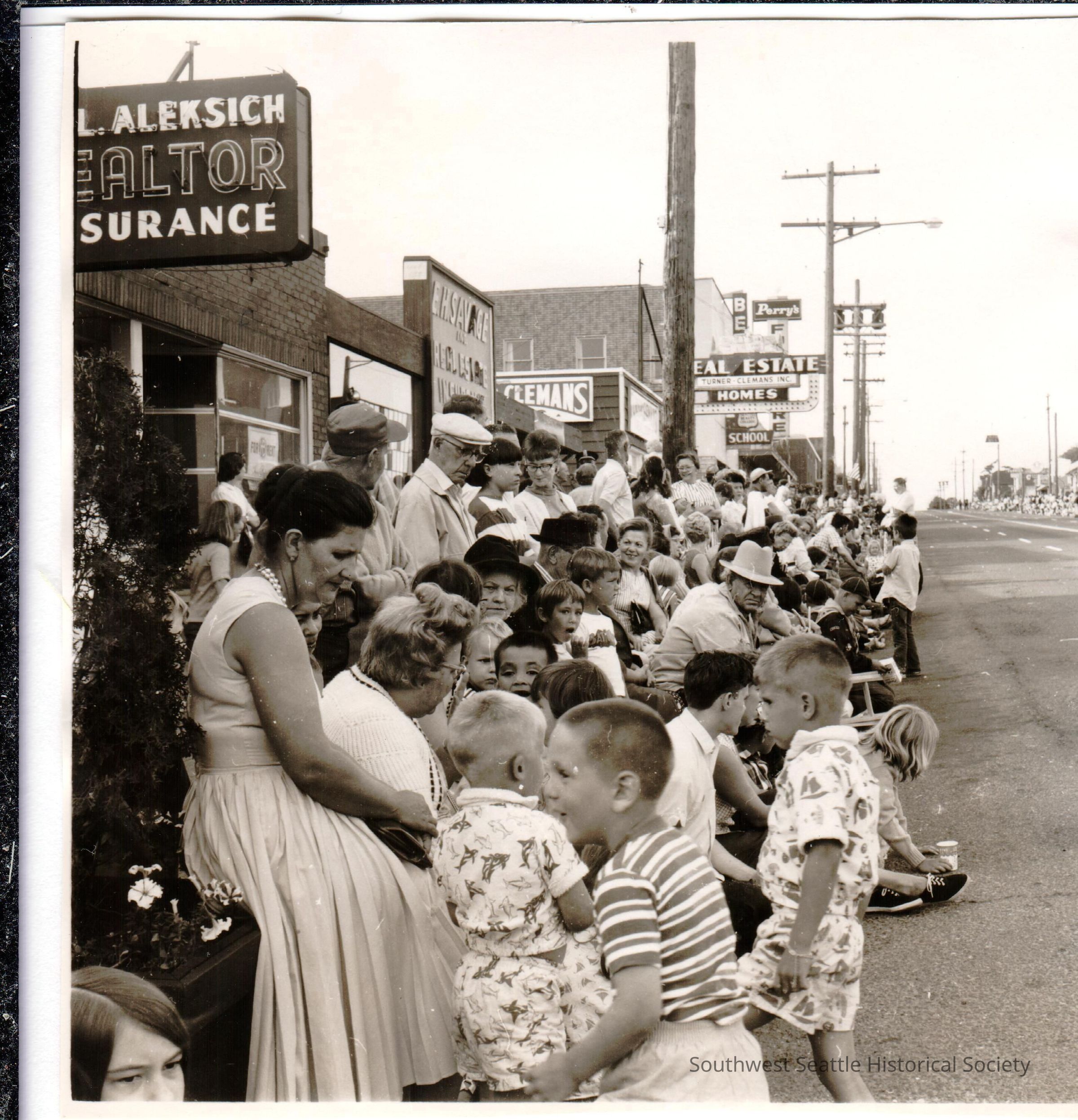 Black and white. Audience waiting for the 1966 Hi-Yu Parade, on the 4300 Block on west side of California Avenue.