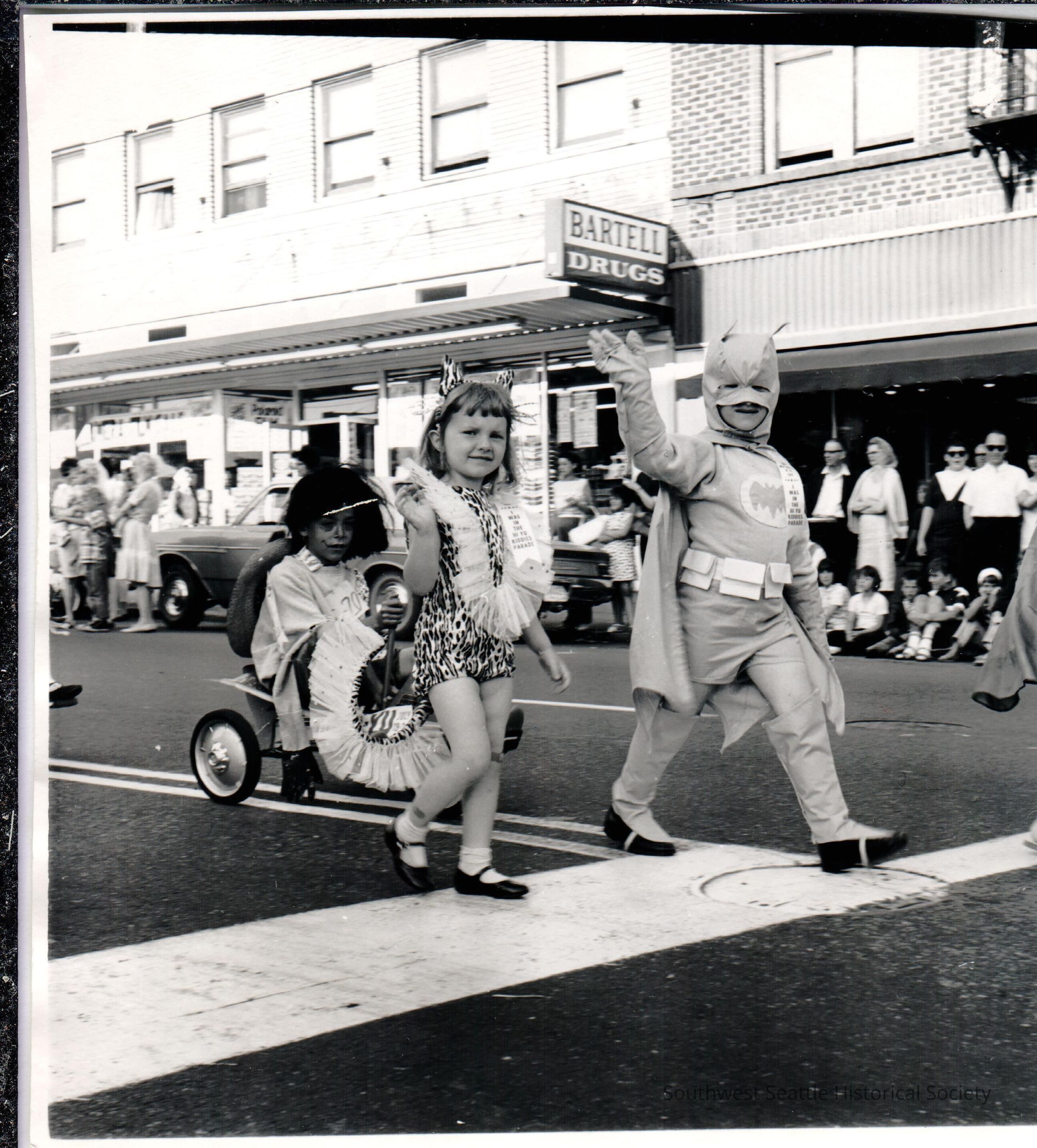 Black and white. A boy dressed as Batman, a girl dressed as Catwoman, and a boy in the cart behind them march during the 1966 Hi-Yu Parade in front of Bartell Drugs. Spectators and cars in the background.