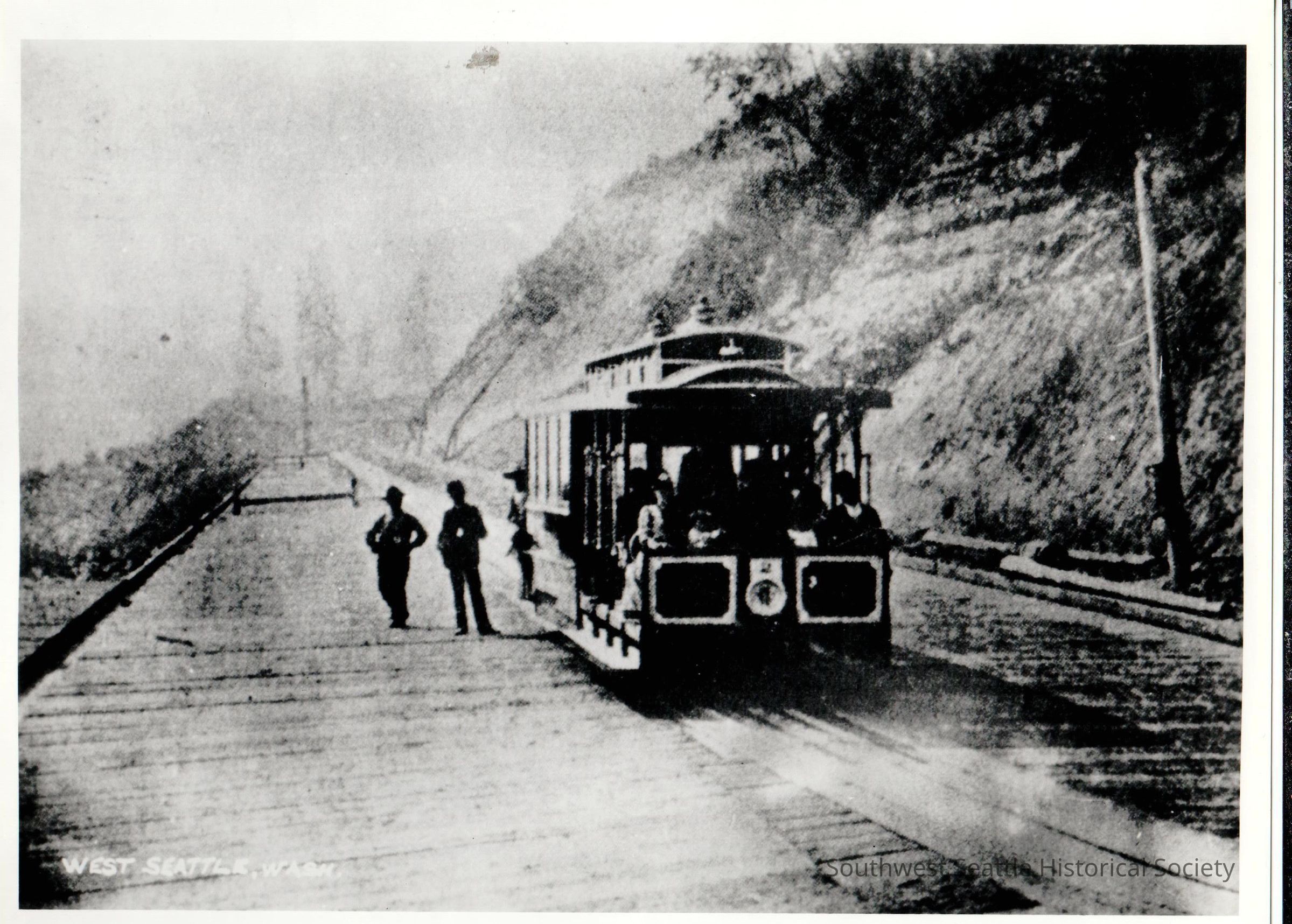 Photograph of a streetcar in an unknown location with two people standing next to it. There is text of "West Seattle, Wash." in the lower left corner of the photograph.