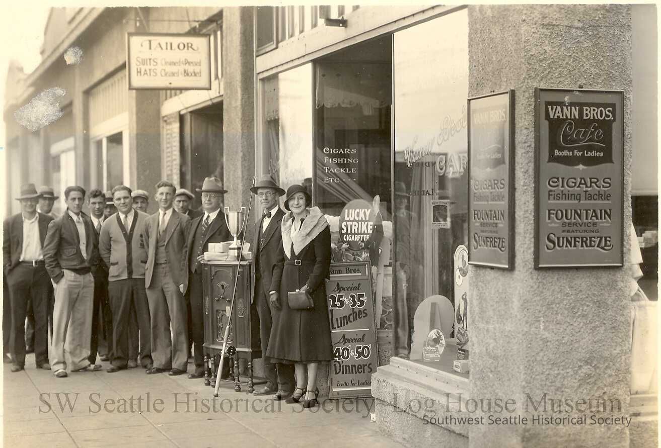 The first Vann Brothers Restaurant was located in the Admiral District, across from Lafayette Elementary School. The happy folks out front are fishing derby winners in the 1920's, posing with their prizes. One lucky winner has received the large piece of furniture in the center, a radio.