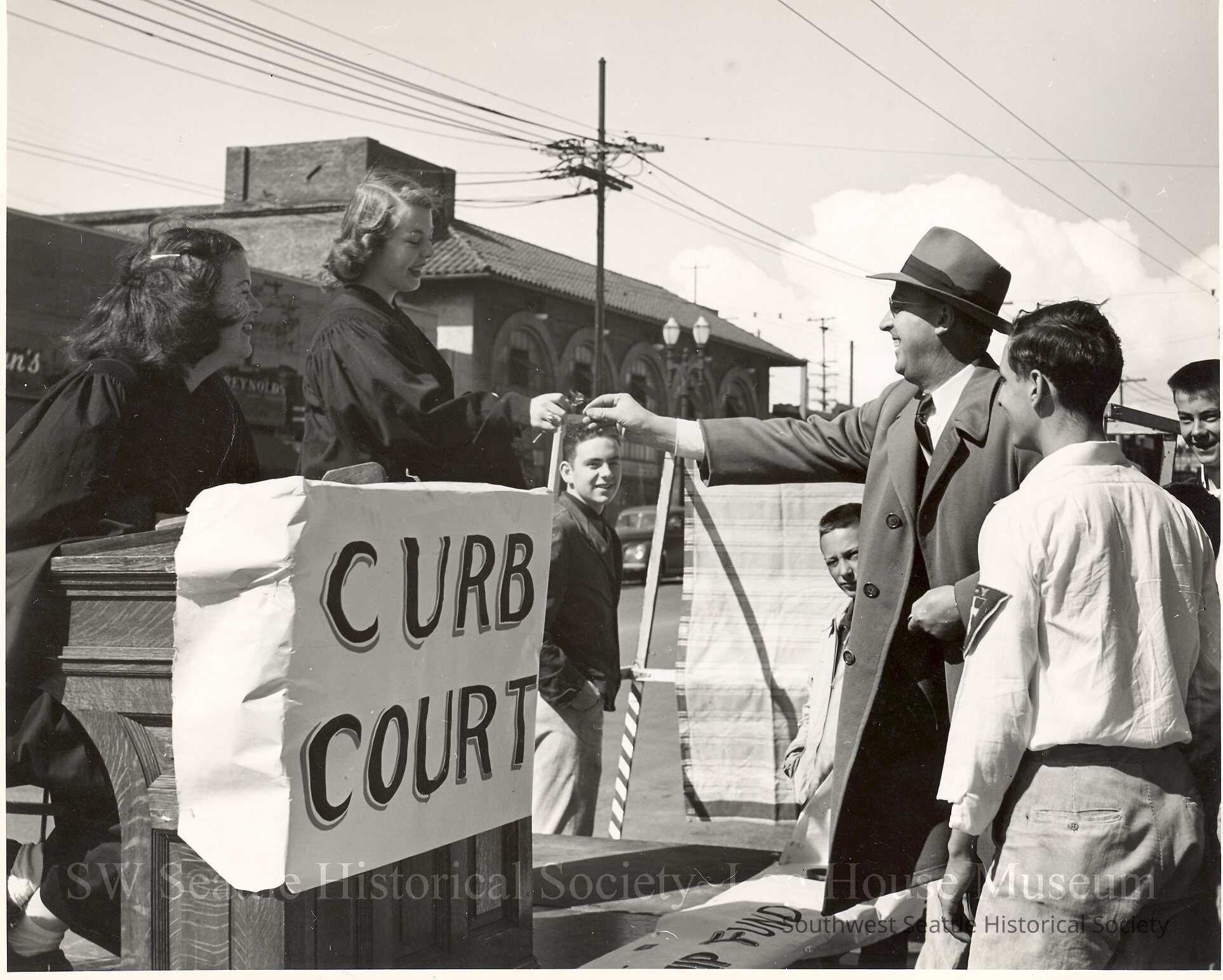 B&W. YMCA. Fund raising "Curb Court" at California and Alaska, 4/6/1947. Donated by Normie Beers. Power house building in the background. 4500 block of California Avenue, "long torn down".