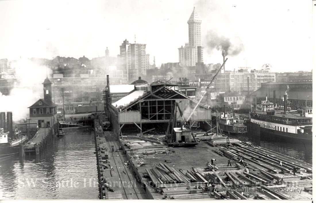 Black and white. Repairs to grand trunk pacific dock in late 1914, after it burned July 30th. Shows SFD Fire Station #5, the fireboat "Duwamish," and the ferry "West Seattle" at its Marion Street Dock.