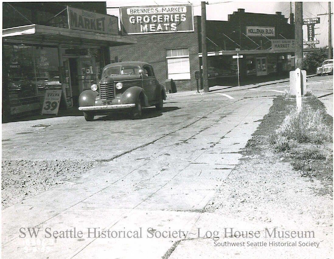 B&W. Brenner's Market in Youngstown, corner of Delridge way and Andover. Circa 1930. Source: Seattle Dept. of Engineering.