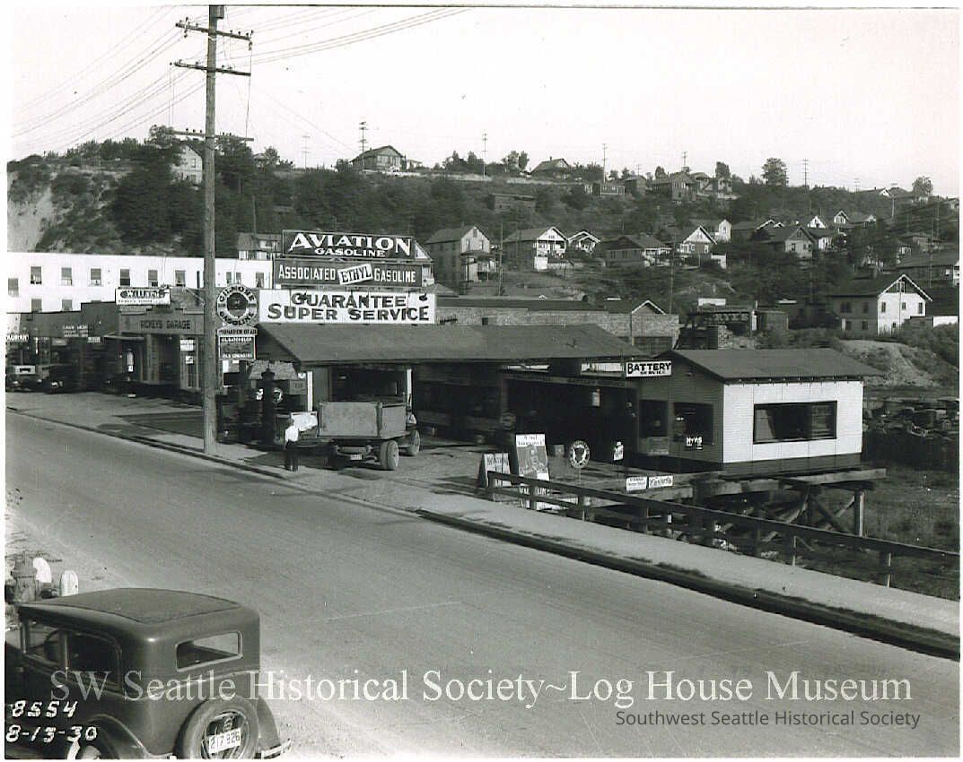 B&W. Gilmore Gas station on Spokane street. Facing southeast, shows nearby businesses and homes in Youngstown in background. Source: Seattle Dept. of Engineering