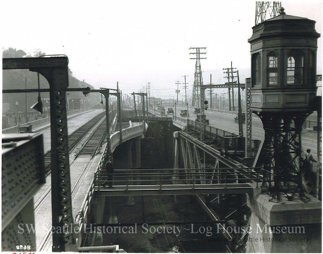 B&W. Two Spokane Street bridges taken around 1930, facing West. Shows temporary streetcar tracks on South span. Source: Seattle Dept of Engineering