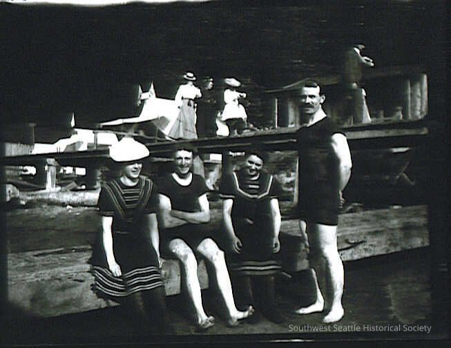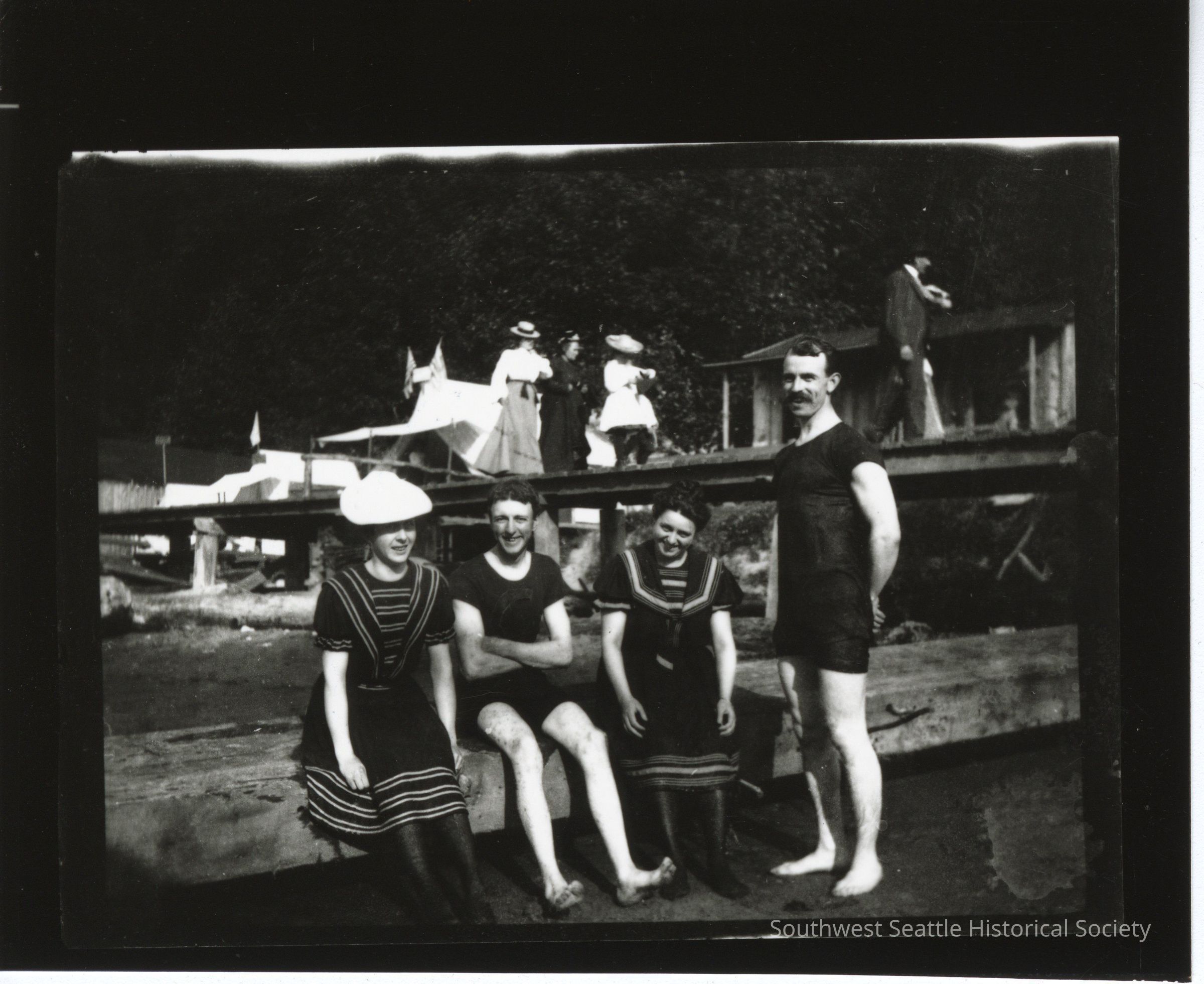 Swimmers on the dock. Two men and two women in bathing suits. pedestrians in the background. No date ca. 1920