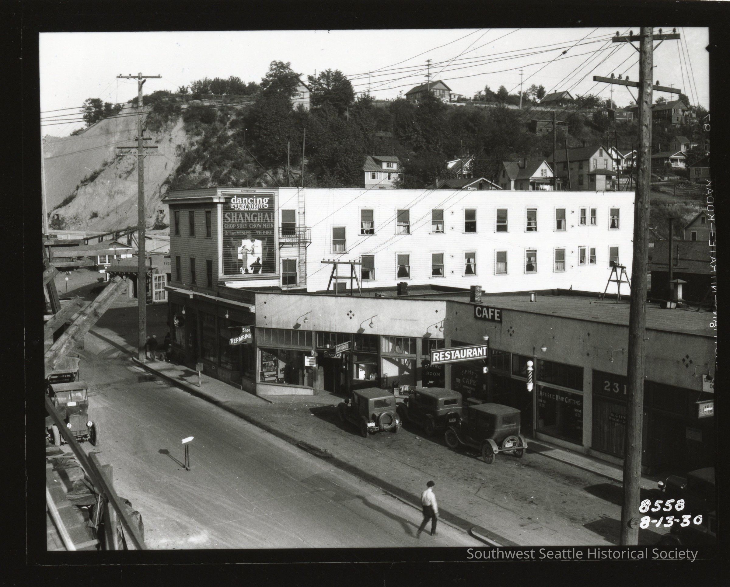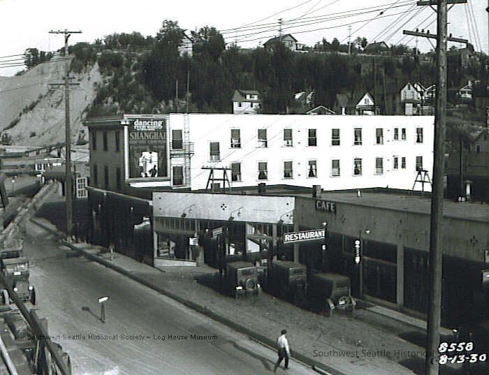 Photo of businesses (restaurant/cafe, shoe repair and apartments) billboard advertising Shanghai restaurant and dancing at 2nd and Yesler and Pike streets. Dated August 13, 1930.