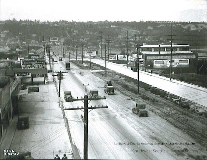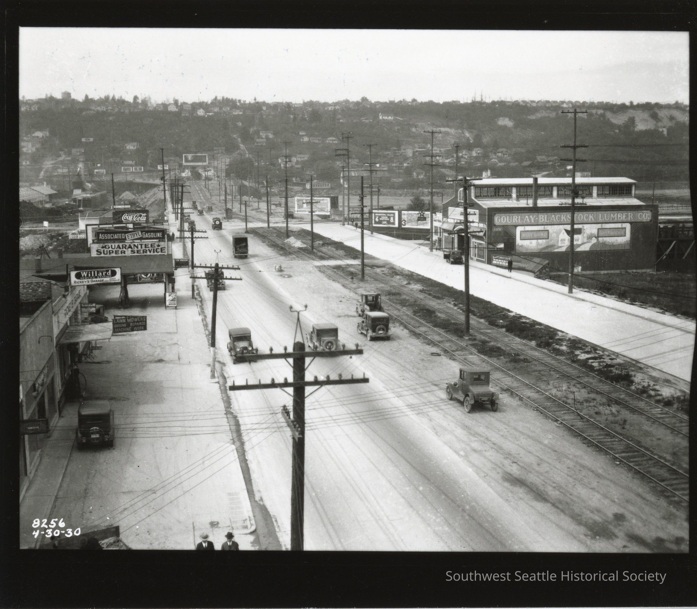Roadway with cars and railroad tracks. Businesses on sides including Gourlay-Blackstock Lumber C. and Associated Gasoline and service station. Dated April 30, 1930.