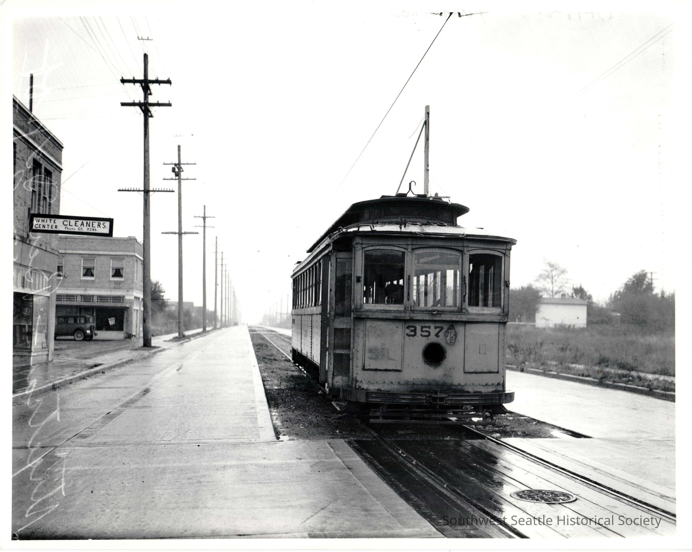 Shows broken steetcar used as a waiting station for bus riders. Streetcar is number 357. White Center Cleaners shown on the left. Streetcar was stranded in White Center after a landslide blocked the tracks to the north. Photo was used in West Side Story.Collection
