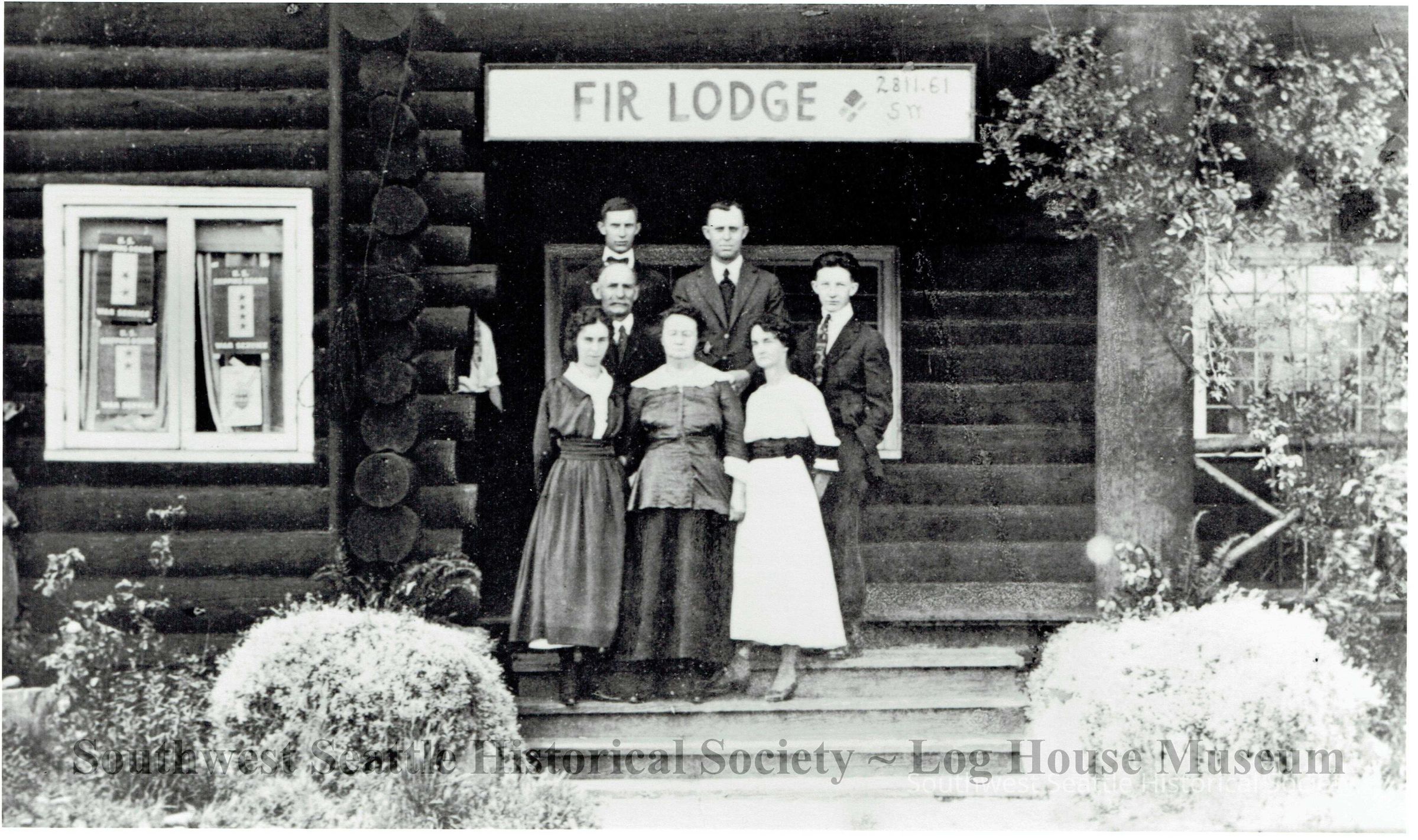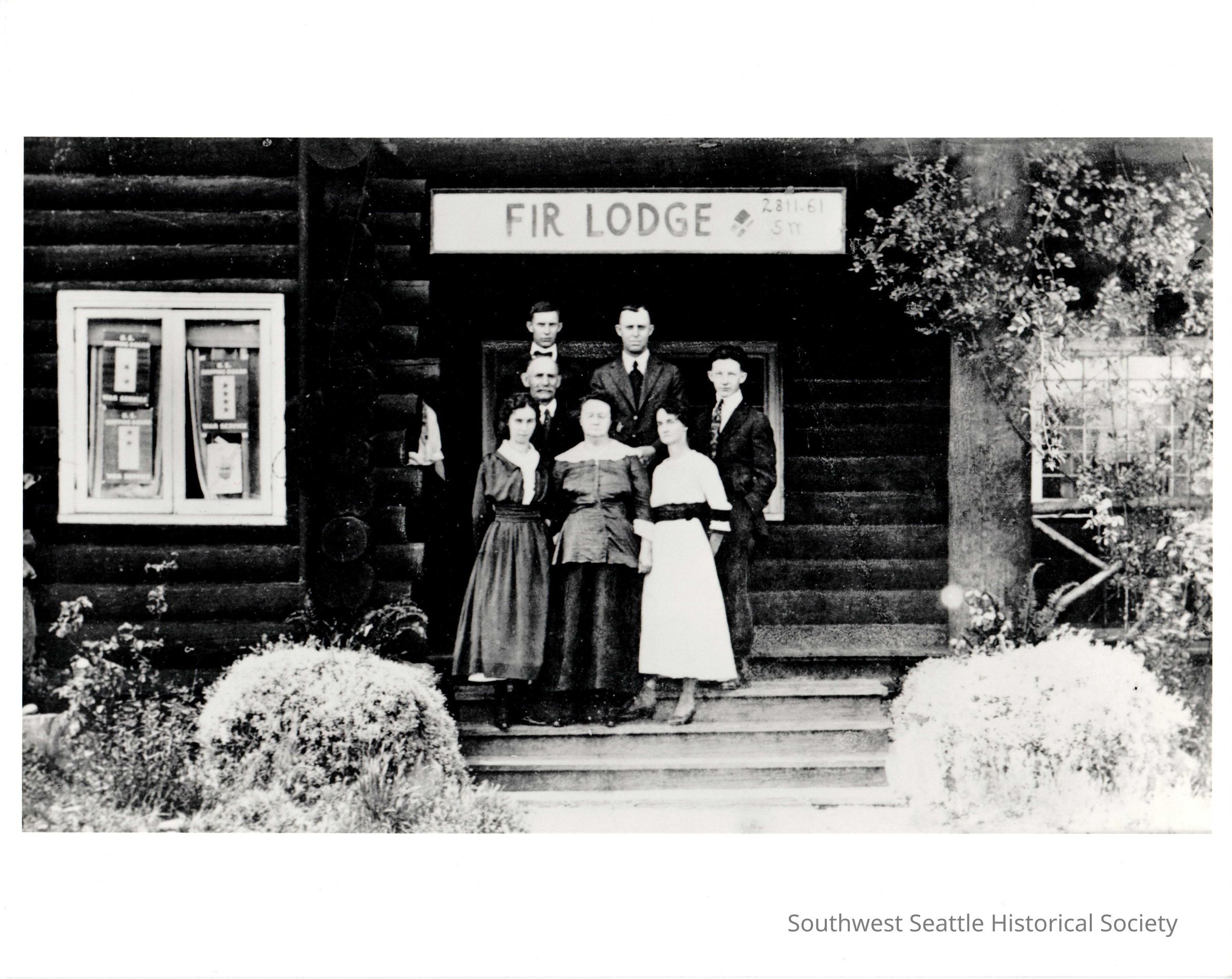 View of "Fir Lodge" entrance. "Fir Lodge" later became the "Alki Homestead" Restaurant. A group of four men and three women are posing in the steps, dressed in formal attire. A set of 4 "war service" placards are hung in the window at left. Sign above reads "Fir Lodge" 2811 61 SW.Collection