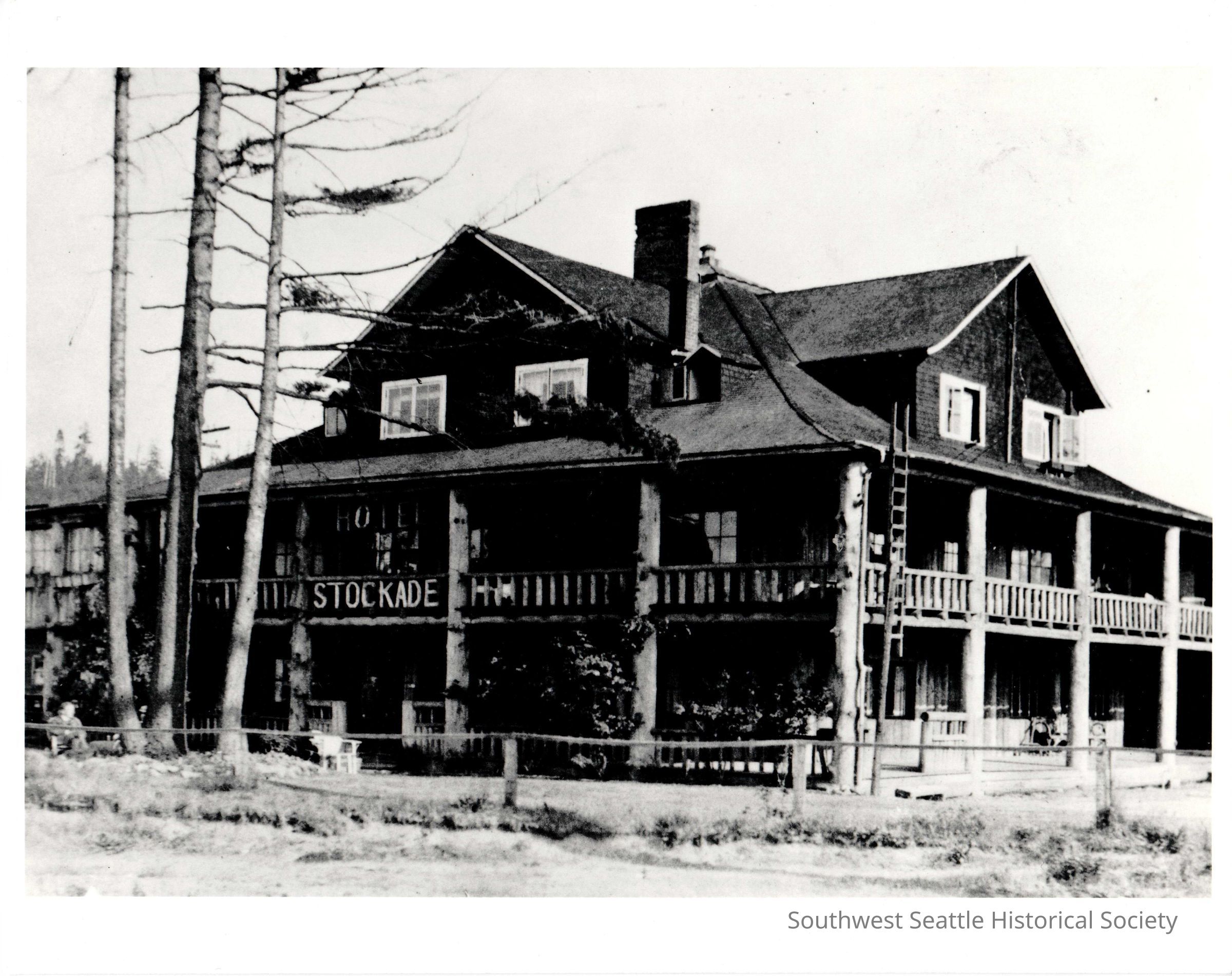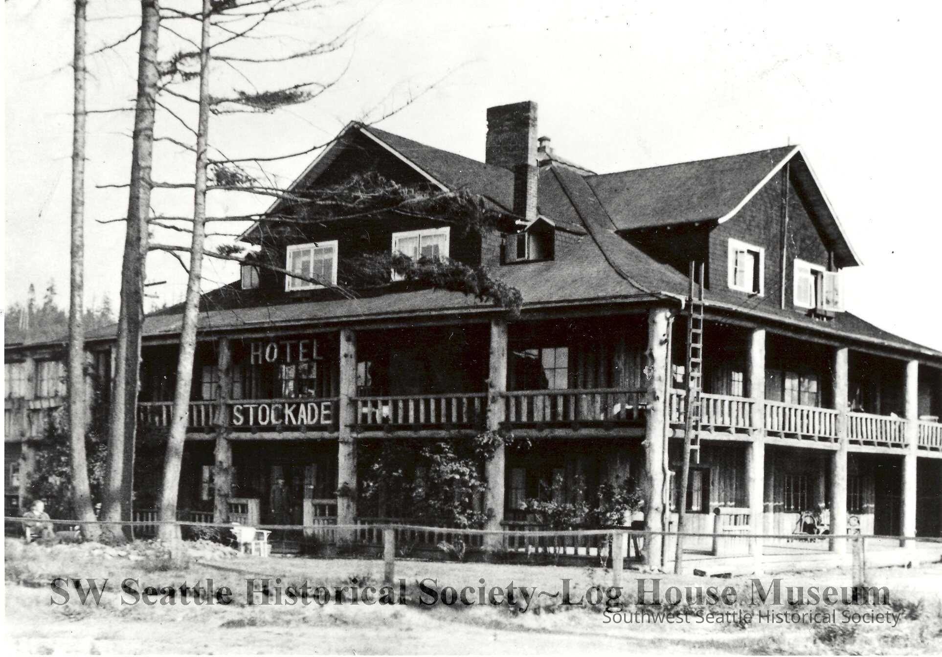 View of "Stockade Hotel" at 63rd + Alki Ave. Constructed of vertical pieces of salvaged driftwood from Alki Beach. Was a popular resort hotel. Failed in 1936 and was torn down later.Collection