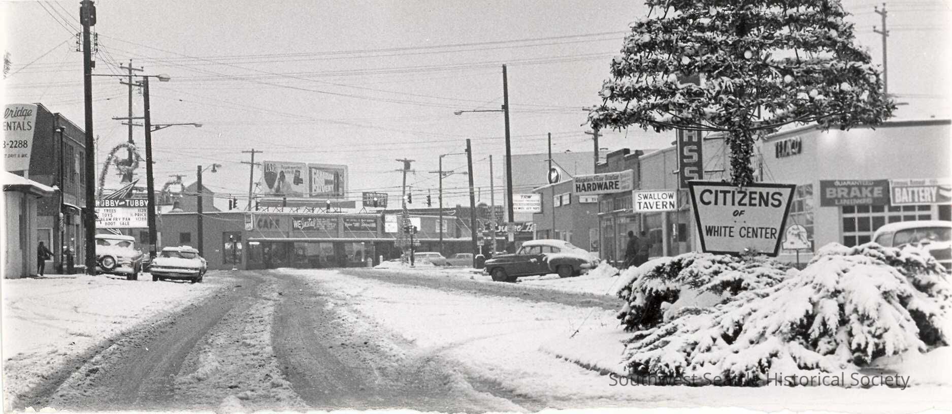 White Center covered in snow. Business signs visible: "Citizens of White Center", "Swallow Tavern", "Hughes True Value Hardware", "Chubby and Tubby". Written on side margin of photo: "Welcome to White Cnt". Publication marks also written on side margin.Collection