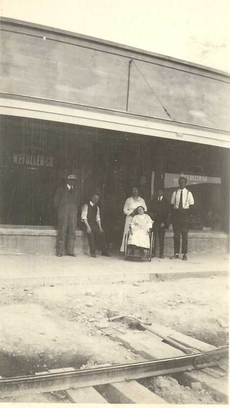 5 people in doorway in front of building, window of which reads "W P Fuller Co". Man in suit and hat standing on left, man in shirtsleeves and vest sitting on low ledge, woman standing behind a woman in a wheelchair, man in suit standing, and man in shirt and tie standing. Railroad tracks in foreground of photo. Back reads "R -" "Nelson Van Zile" "Erol? H """ below, then "Mrs """ below that, then "Ella """ below that. "Other 3 unidentified" and "Same as A". Back of photo stamped "3 03". In folder marked "CITYSCAPE". White CenterCollection