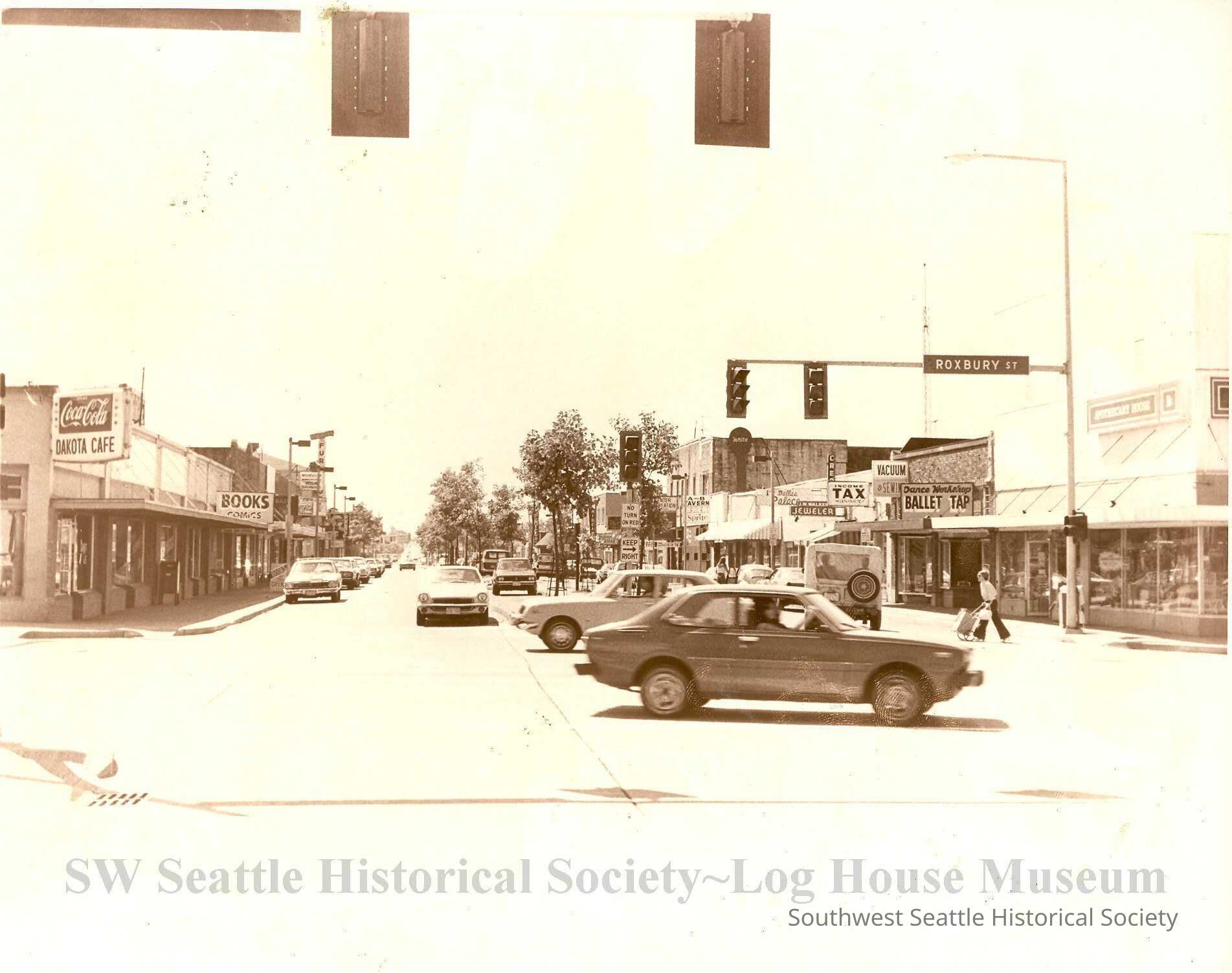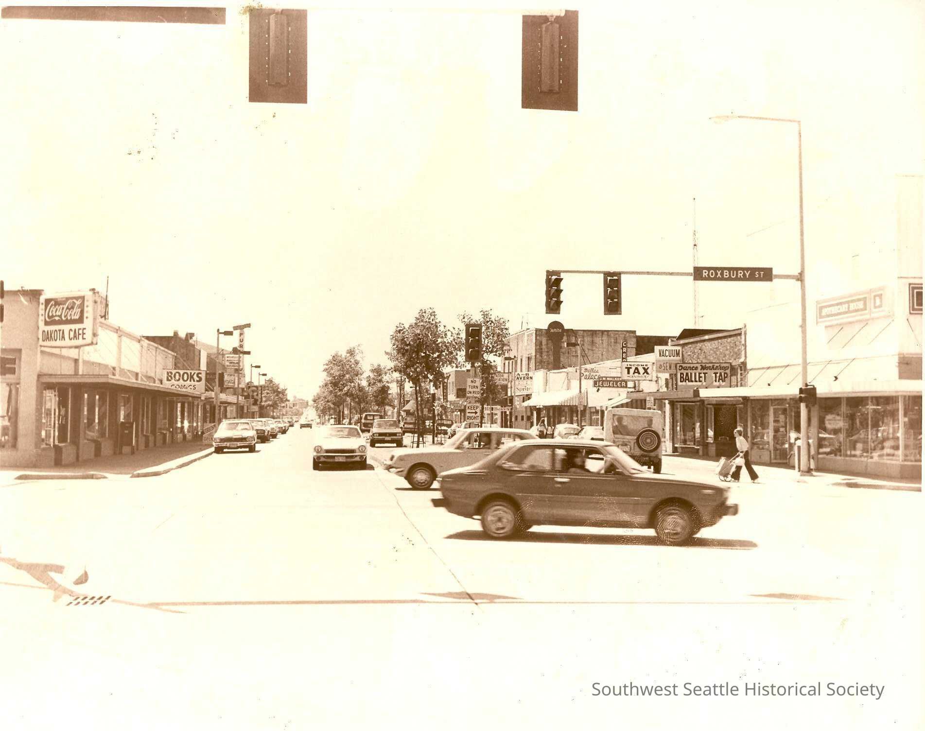 Traffic and business looking down cross street at intersection with Roxbury. "ROXBURY ST" sign and traffic signals visible, along with "NO TURN ON RED" and "KEEP RIGHT". Numerous parked and moving vehicles. Pedestrian crossing the street. Business signs include "CocaCola DAKOTA CAFE" "BOOKS COMICS" "FURNITURE" on left side of street. Signs on right include "A-B' TAVERN Sprite" 'JEWELER" "INCOME TAX" "VACUUM SEWING" "Dance Workshop BALLET TAP" and "APOTHECARY HOUSE". In folder marked "CITYSCAPE". White CenterCollection