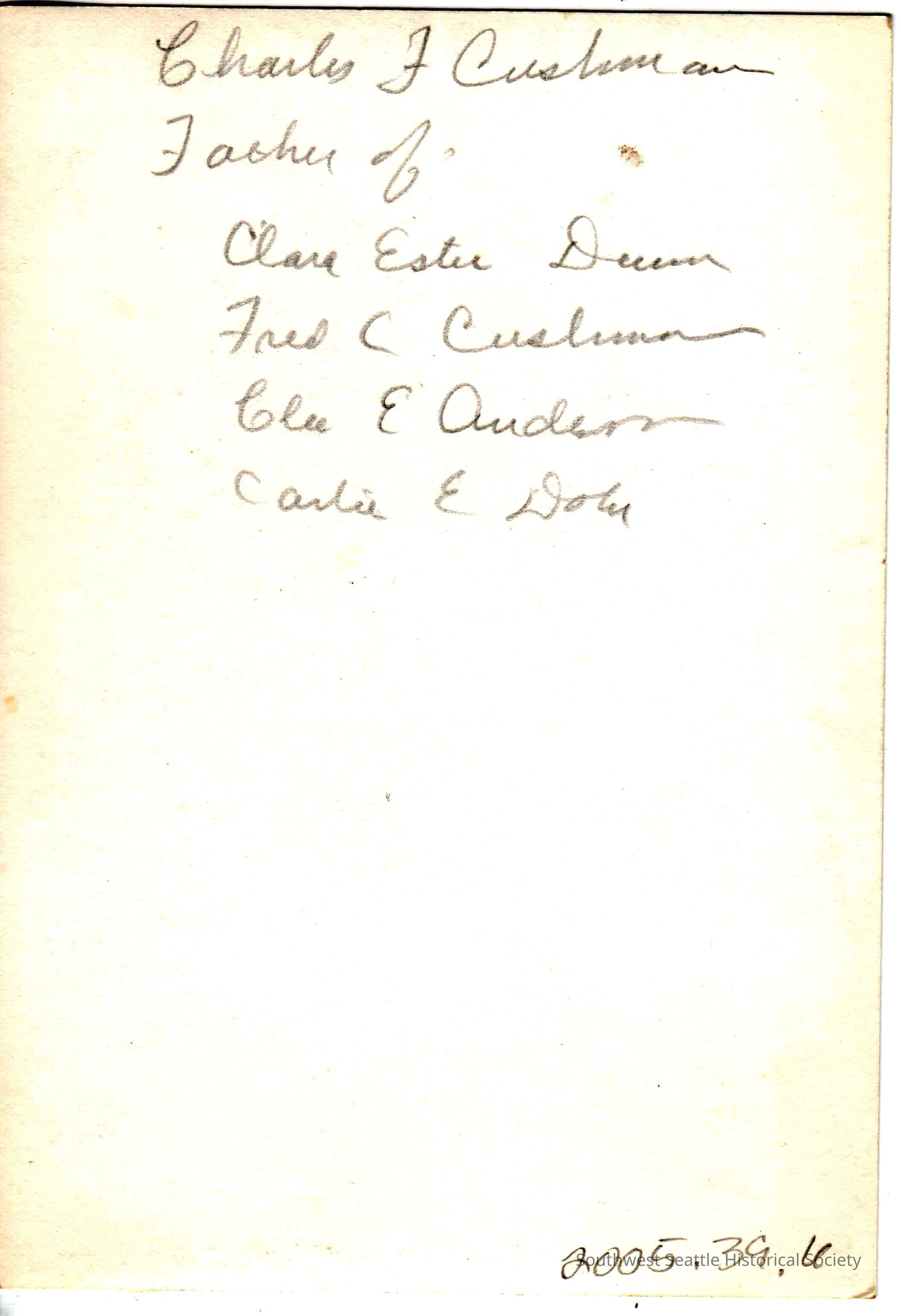 South Park, Charles F. Cushman, father of Clara Ester Dunn(?), Fred C. Cushman, Cleo E. Anderson (?), Carlie E. Dotie.