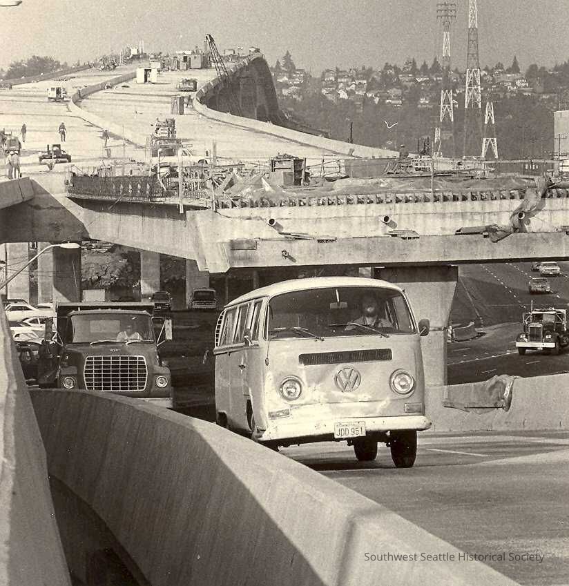 Volkswagen van, followed by truck, driving up ramp to West Seattle bridge. Bridge construction visible. Red markings and word "crop" written in margin. Green preprinted note taped to back of photo, with preprinted categories, and handwritten specific information "Publication 1136 percent 59 Col. Width 1 3/4 Copy identification VW bus". Box marked "Return to our WS NEWS department." Written in red on green note "BRIDGING THE GAP". In folder marked "Bridging the Gap Photos" inside folder marked "WEST SEATTLE BRIDGES".Collection