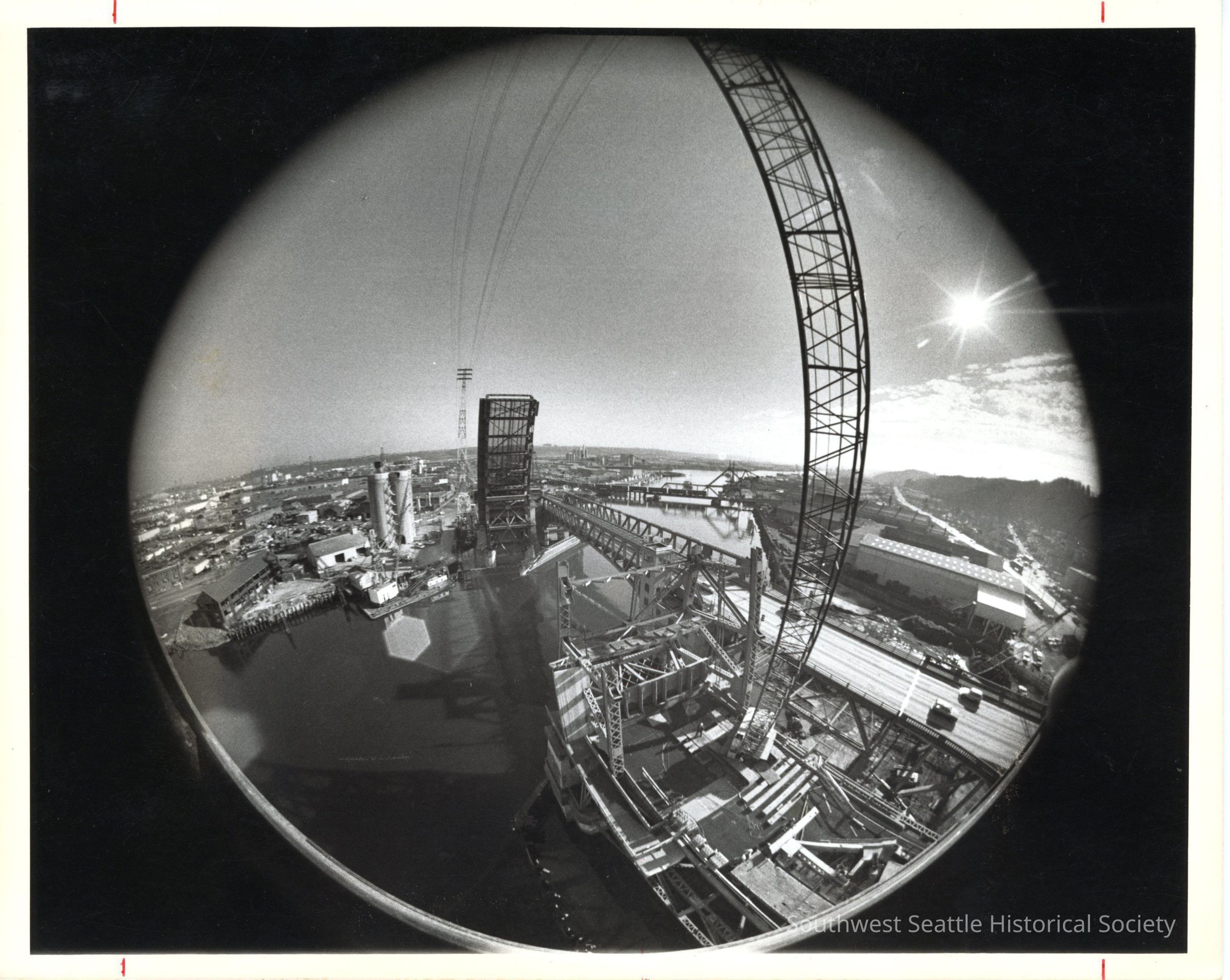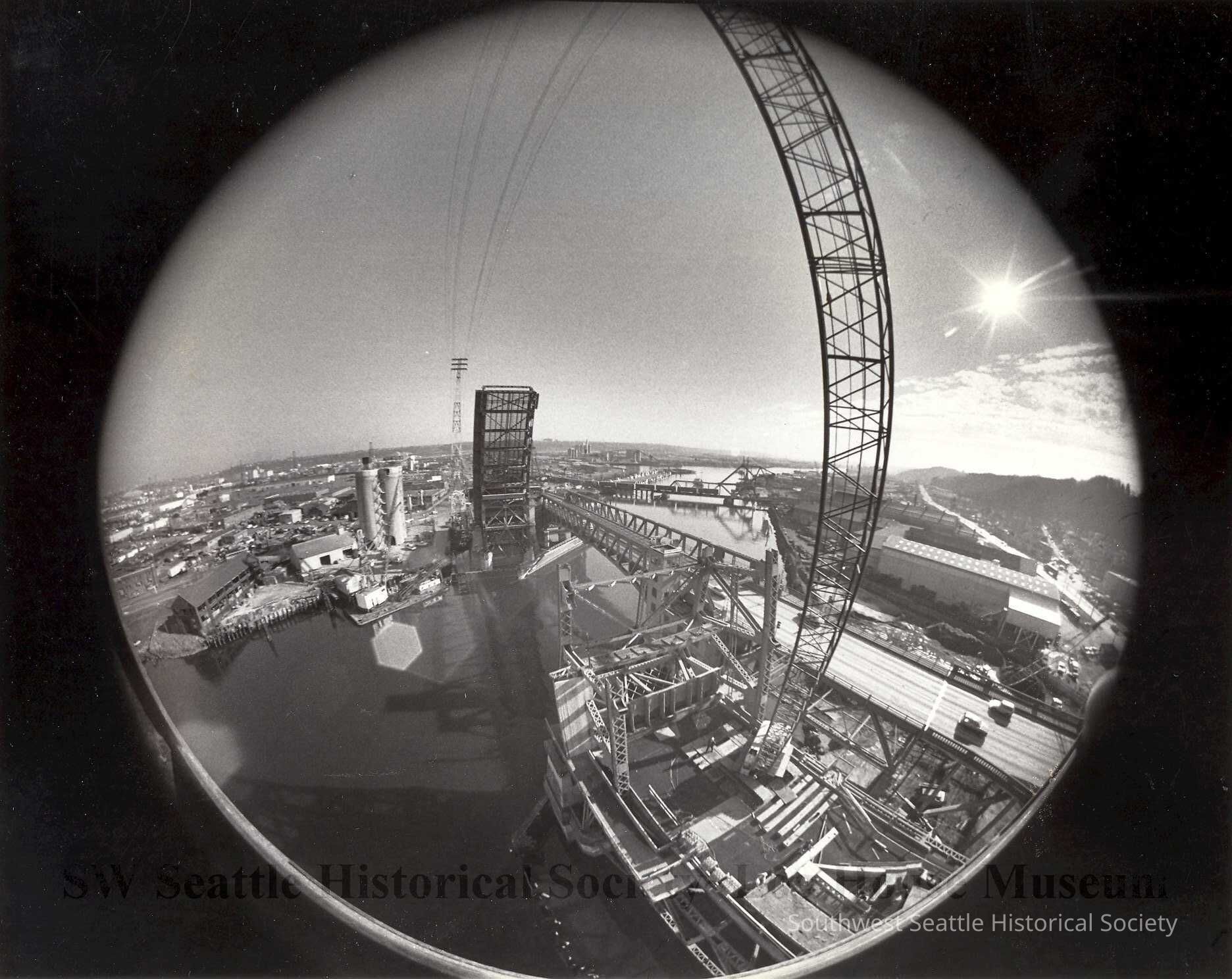 Fisheye lens view from above of West Seattle Bridge and surrounding area. Sun reflecting in upper left of photo. Green preprinted note taped to back of photo, with preprinted categories, and handwritten specific information "Publication 1174 percent 98 Col. Width 5 1/4 Copy identification Fish eye". Box marked "Return to our NEWS department." and "WS". Written in red on green note "BRIDGING THE GAP". Red markings in margin on photo. In folder marked "Bridging the Gap Photos" inside folder marked "WEST SEATTLE BRIDGES".Collection
