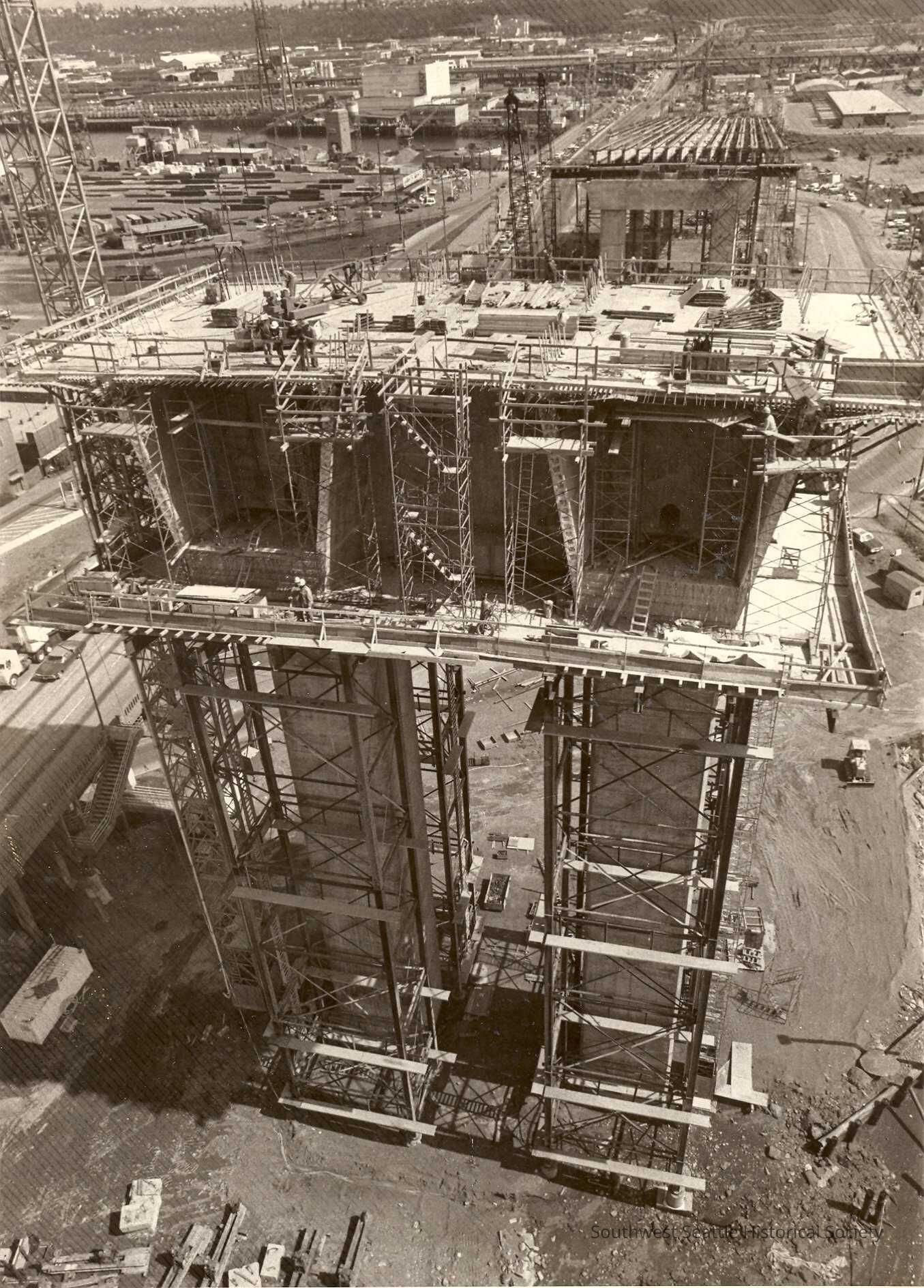 View from above of tower and surrounding area. Green preprinted slip taped to back with categories preprinted and specific information handwritten in marker "Publication 1173 Copy identification Close-up tower". Box marked on green slip "Return to our NEWS department." and "WS" written in. In folder marked "Bridging the Gap photos" inside folder marked 'WEST SEATTLE BRIDGES".Collection