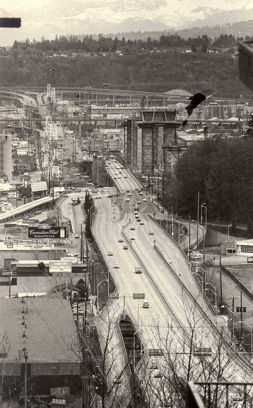 Aerial view of bridge with light traffic and surrounding area. Green preprinted slip taped to back with categories preprinted and specific information handwritten in marker "Publication 1183-B percent 64 Col. Width 1 3/4 Copy identification Comparison-B". Boxes marked on slip "Return to our NEWS department." and "WS" written in. "BRIDGING THE GAP" printed in red marker on green slip. "07" above line with "190" below line written in ink on green slip. Red lines in each margins, appear to be marking for cropping of photo. In folder marked "Bridging the Gap photos" inside folder marked 'WEST SEATTLE BRIDGES".Collection