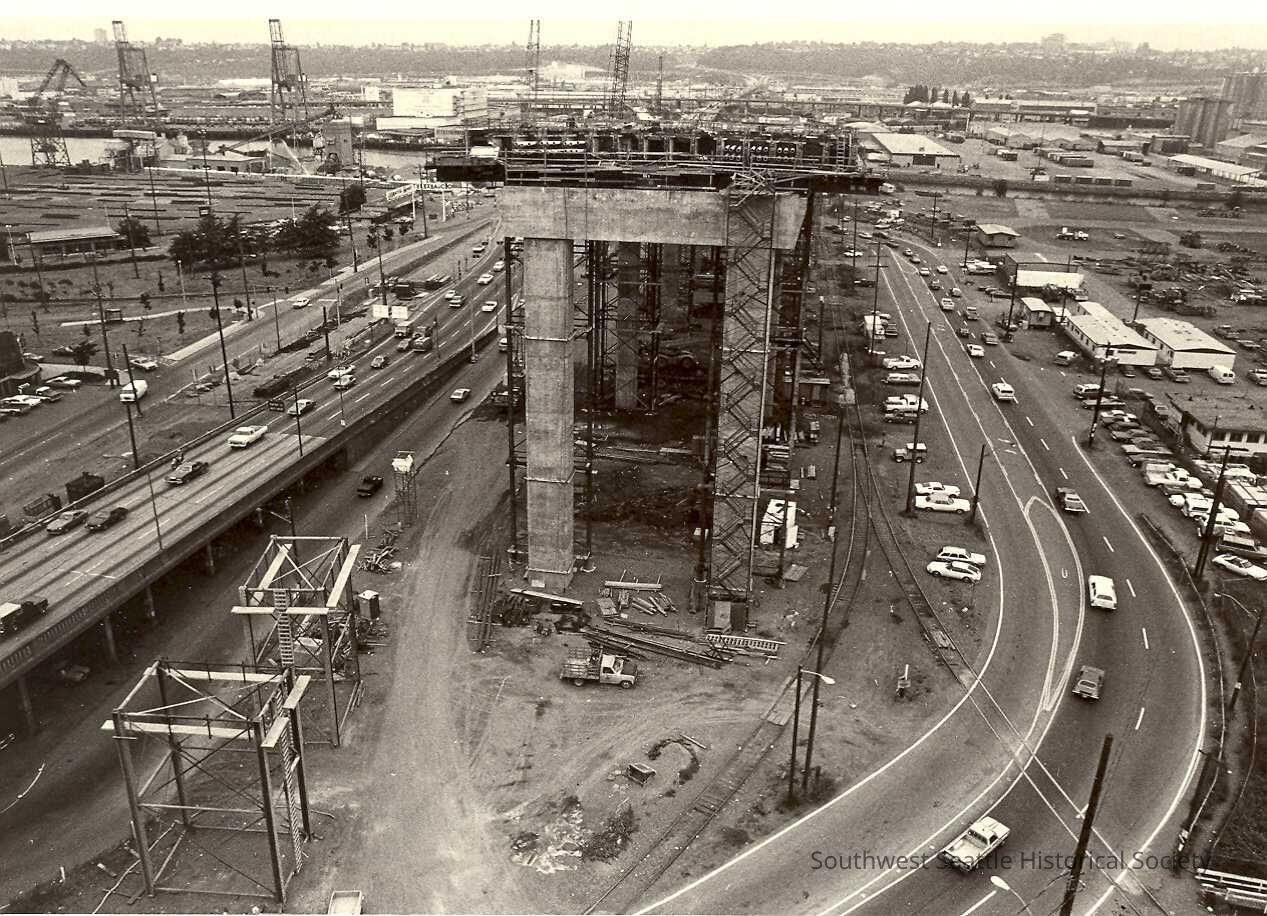 Aerial view of bridge tower under construction, with roads to left and right and surrounding area. Green preprinted slip taped to back with categories preprinted and specific information handwritten in marker "Publication 1139 Copy identification Early tower". Box marked on green slip "Return to our NEWS department." and "WS" written in. In folder marked "Bridging the Gap photos" inside folder marked 'WEST SEATTLE BRIDGES".Collection