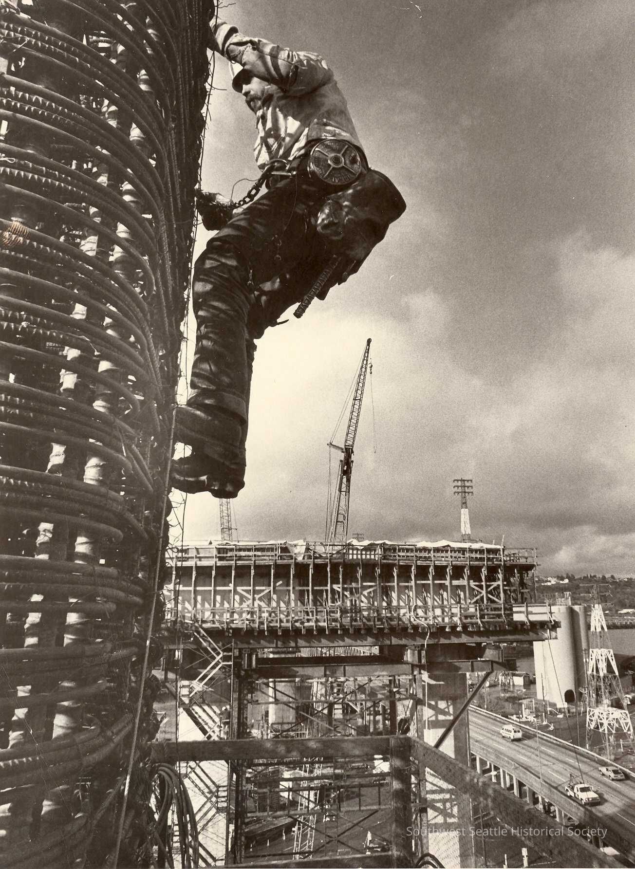 Man working outdoors on side of metal tower on left side of photo, suspended part way up the tower. Cranes and other construction in center of photo. Green preprinted slip taped to back with categories preprinted and specific information handwritten in marker "Publication 1139 percent 60 Col. Width 1 3/4 Copy identification Ironworker". Boxes marked on slip "Check if tab" and "Return to our NEWS department." and "WS" written in. "BRIDGING THE GAP" printed in red marker on green slip. In folder marked "Bridging the Gap photos" inside folder marked 'WEST SEATTLE BRIDGES".Collection