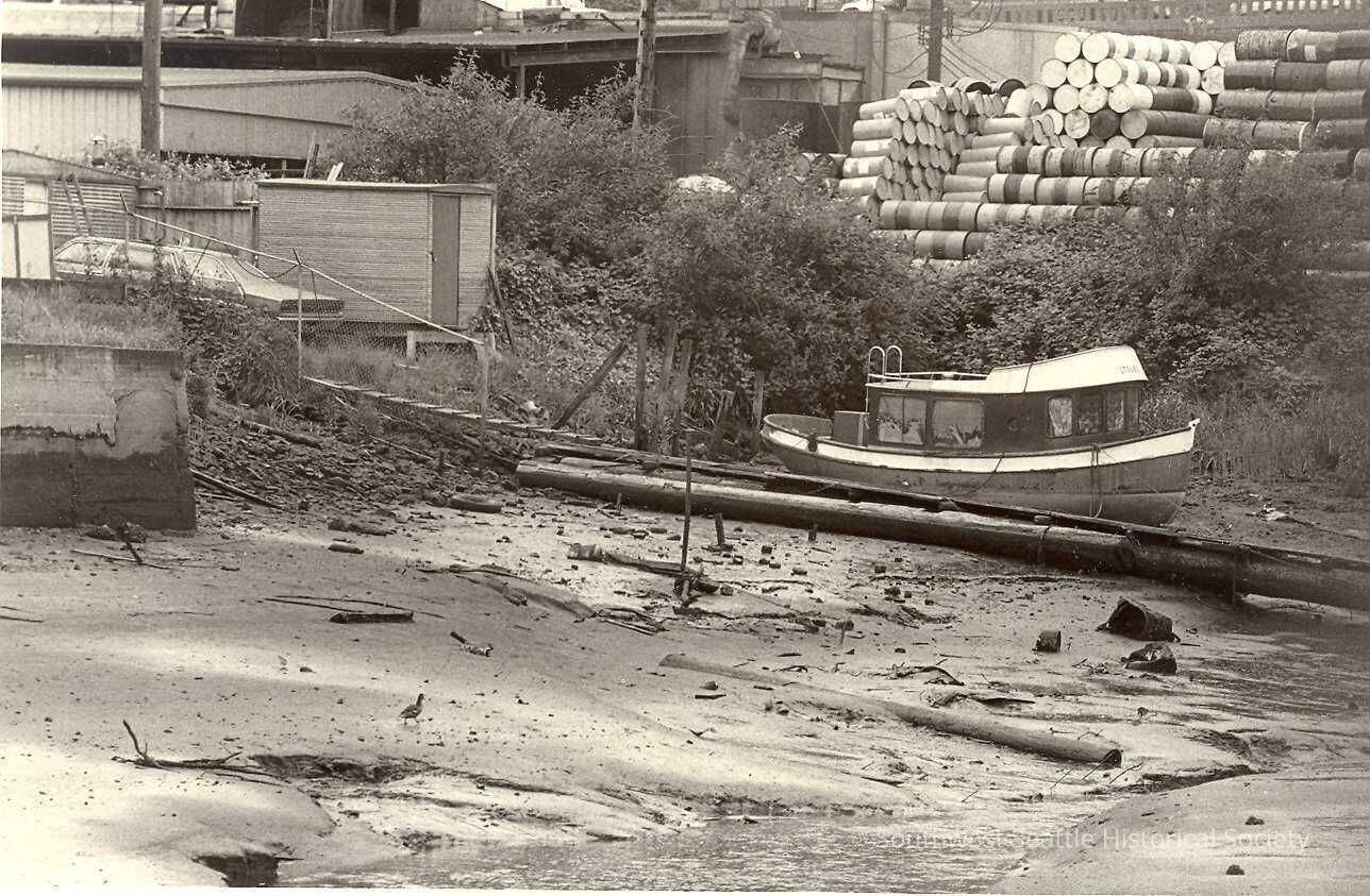 Shoreline with small boat with cabin sitting on beach, in front of bushes and large stack of barrels (at least 9 rows high, stacked on sides). Green preprinted slip taped to back with categories preprinted and specific information handwritten in marker "Publication 1150 Copy identification Shore boat". Box marked on green slip "Return to our NEWS department." and "WS" written in. In folder marked "Bridging the Gap photos" inside folder marked 'WEST SEATTLE BRIDGES". Could be Delridge waterfront or down the Duwamish River at some point.