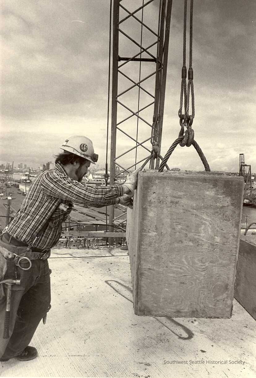 Outdoors construction worker positioning concrete block which is suspended by crane. Block appears to be about 4 feet high and 3 feet wide. Worker is wearing hard hat, plaid shirt, jeans, and a tool belt. He has neck length dark hair, sideburns, mustache and a beard. His side is to the camera. Green preprinted slip taped to back with categories preprinted and specific information handwritten in marker "Publication 1166 Copy identification Concrete block". Box marked on green slip "Return to our NEWS department." and "WS" written in. In folder marked "Bridging the Gap photos" inside folder marked 'WEST SEATTLE BRIDGES".Collection