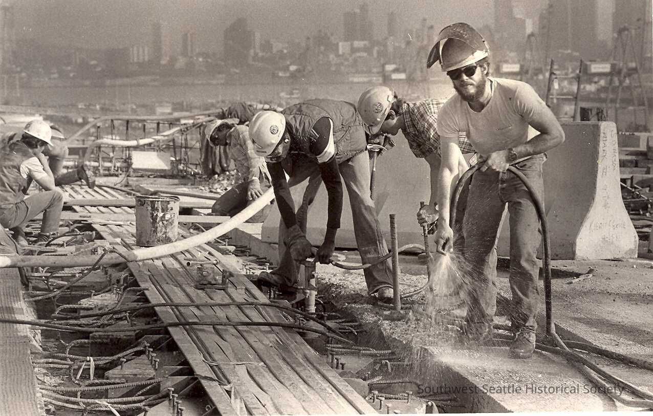 Five workmen in hard hats working with hoses and water, with hazy skyline of city in background. Front worker is facing the camera, wearing sunglasses, and has beard and mustache, wearing t-shirt, hjeans, and boots. Green preprinted slip taped to back with categories preprinted and specific information handwritten in marker "Publication 1134 percent 82 Col Width 3 1/2 Copy identification Men - skyline". Box marked on green slip "Check if tab", "Return to our NEWS department." and "WS" written in. "BRIDGING THE GAP" written in red marker on green slip. In folder marked "Bridging the Gap photos" inside folder marked 'WEST SEATTLE BRIDGES".Collection
