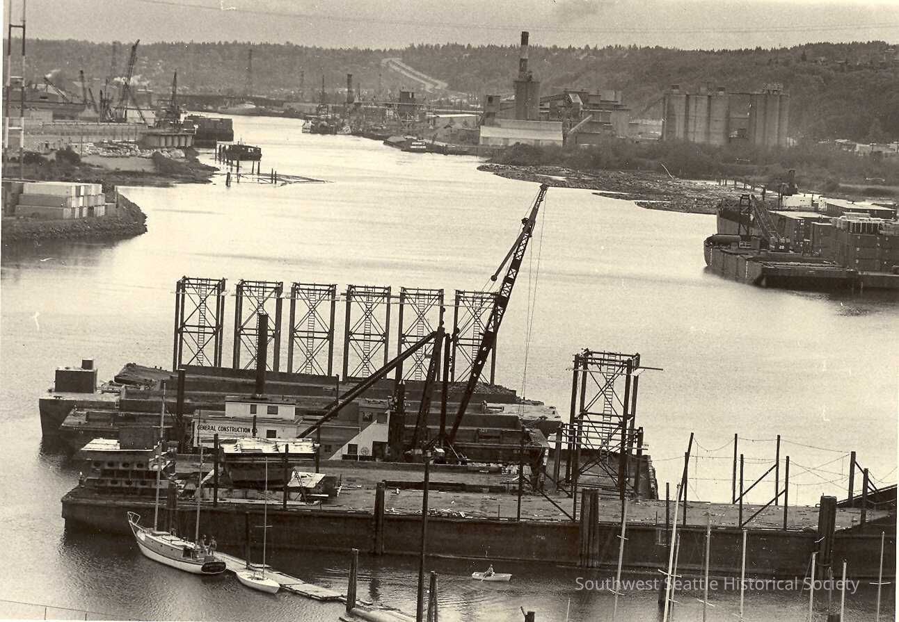 Duwamish waterway with two docks, crane on one. Several small boats next to dock. View looking down waterway, with shore on both sides. Green preprinted slip taped to back with categories preprinted and specific information handwritten in marker "Publication 1168 percent 120 Col Width 5 1/4 Copy identification Duwamish". Box marked on green slip "Check if tab", "Return to our NEWS department." and "WS" written in. "BRIDGING THE GAP" written in red marker on green slip. In folder marked "Bridging the Gap photos" inside folder marked 'WEST SEATTLE BRIDGES".Collection