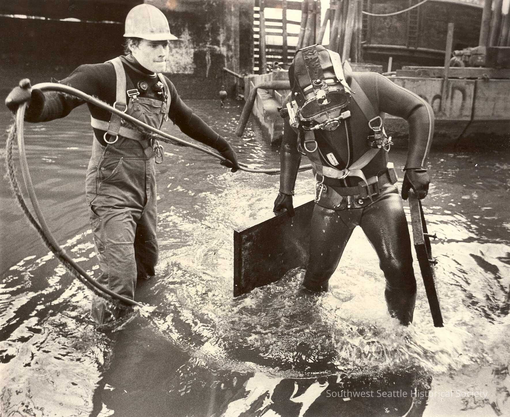 Young male worker standing on left in hard hat and coveralls, holding cables. Scuba diver standing on right holder rectangular plates in each hand. Water is at calf level. Green preprinted slip taped to back with categories preprinted and specific information handwritten in marker "Publication 1170 Copy identification Sunk barge". Box marked on green slip "Return to our NEWS department." and "WS" written in. In folder marked "Bridging the Gap photos" inside folder marked 'WEST SEATTLE BRIDGES".Collection