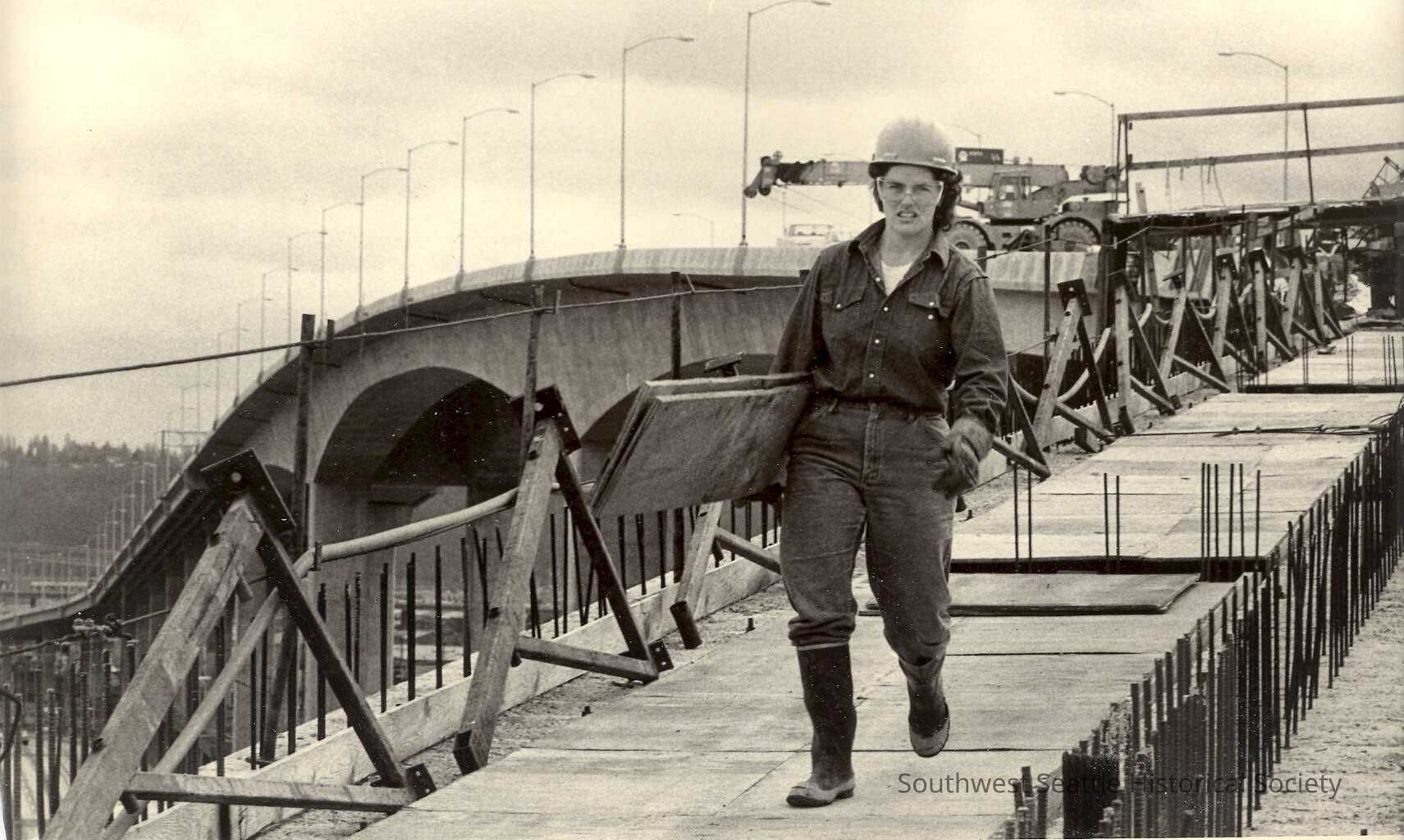 Young worker in hard hat, jeans, shirt, and knee high boots, wearing safety goggles, walking across unfinished bridge carrying wood planks. Black scribble in right margin, possibly initials "Py". In folder marked "Bridging the Gap photos" inside folder marked 'WEST SEATTLE BRIDGES".Collection
