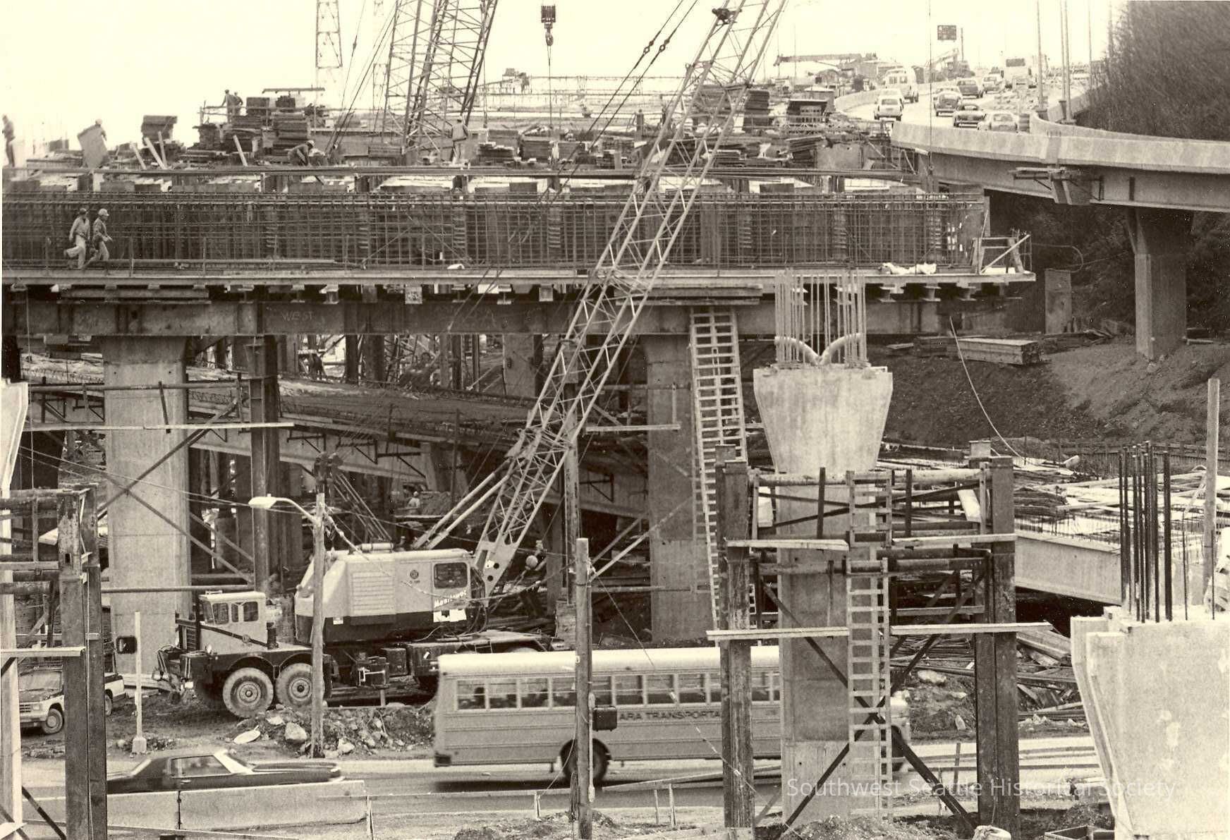 Bridge under construction, with crane in foreground, and traffic on street passing through construction on both sides. Traffic on bridge to right. Black scribble in bottom margin, possibly initials "Py". In folder marked "Bridging the Gap photos" inside folder marked 'WEST SEATTLE BRIDGES".Collection