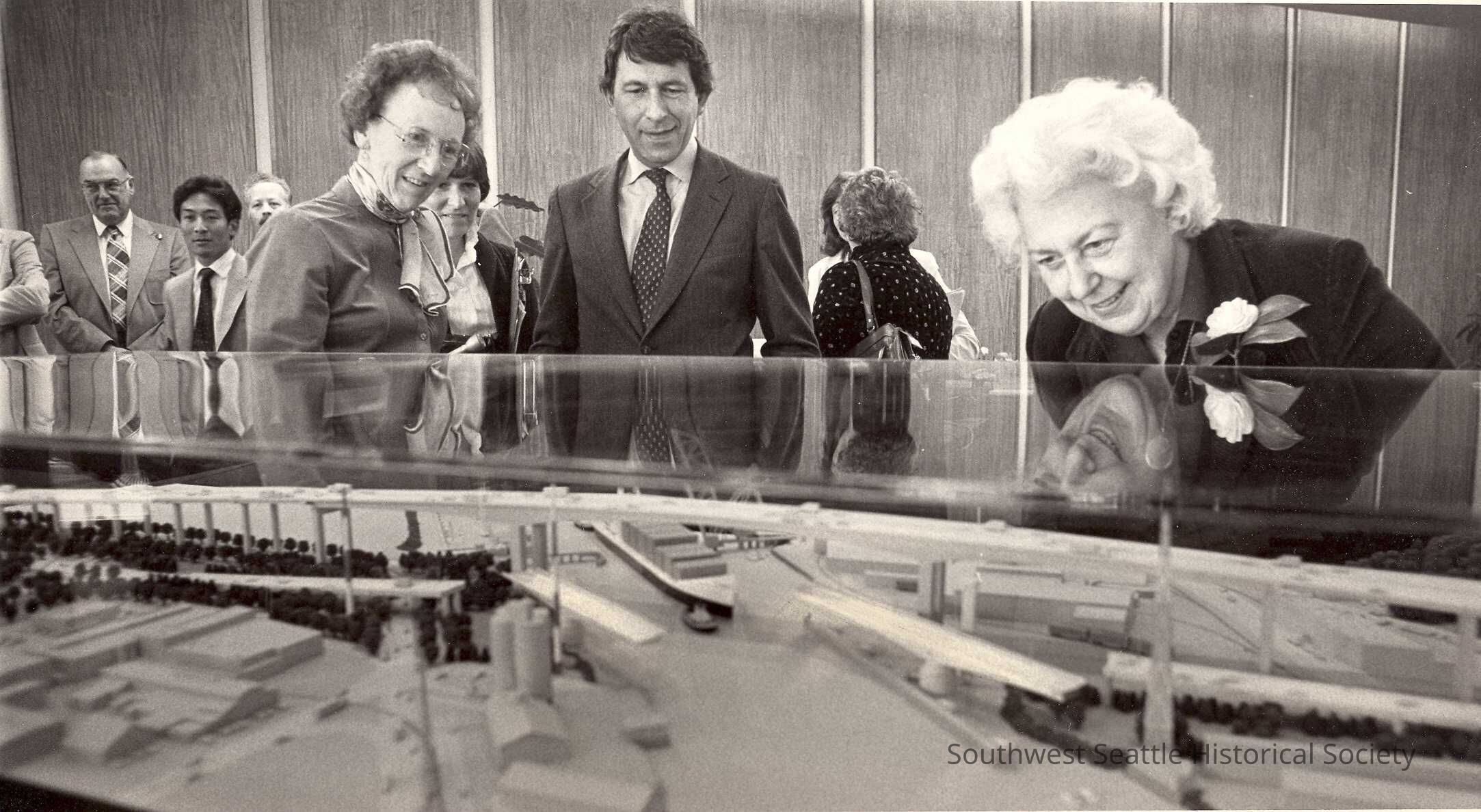 “Seattle mayor Charles Royer and city council member Jeanette Williams view a scale model of the lower-level Spokane Street Bridge in March of 1984. Williams chaired the transportation committee and played a key role in getting the high-level West Seattle Bridge built. Various agencies raised $172 million to fund the bridge. In recognition of Williams’s efforts, the high-level bridge was also named the Jeanette Williams Memorial Bridge in 2009.”Collection