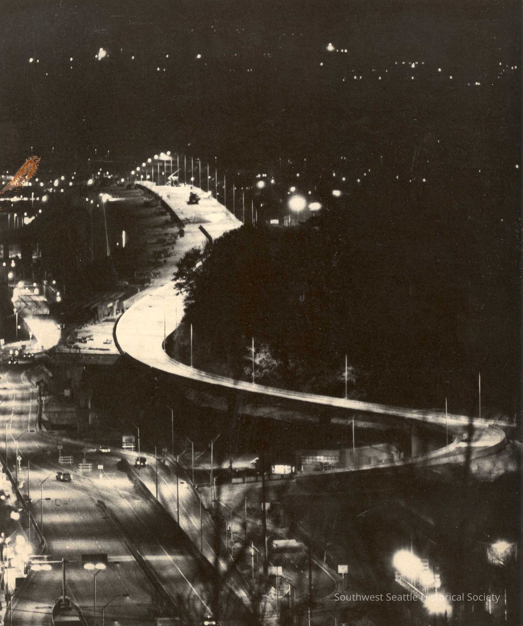 View from above of bridge lit up at night, and traffic below. In folder marked "Bridging the Gap photos" inside folder marked 'WEST SEATTLE BRIDGES".