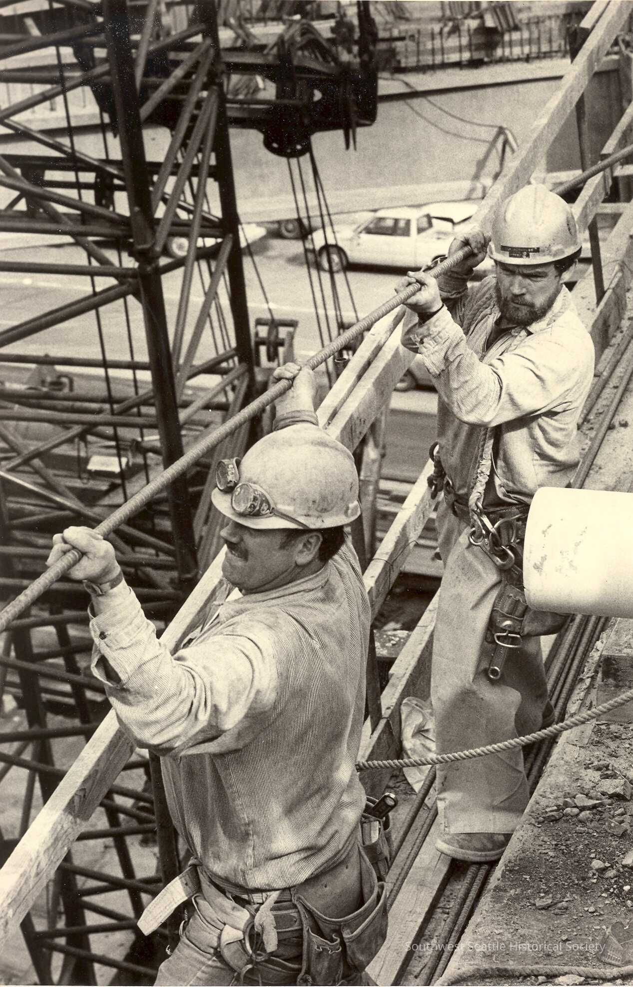 Two workmen on scaffolding, in hardhats and work clothes with tool belts, one with a dark beard and mustache, listing a long piece of rebar. Black scribble in right margin, possibly initials "Py". In folder marked "Bridging the Gap photos" inside folder marked 'WEST SEATTLE BRIDGES".Collection