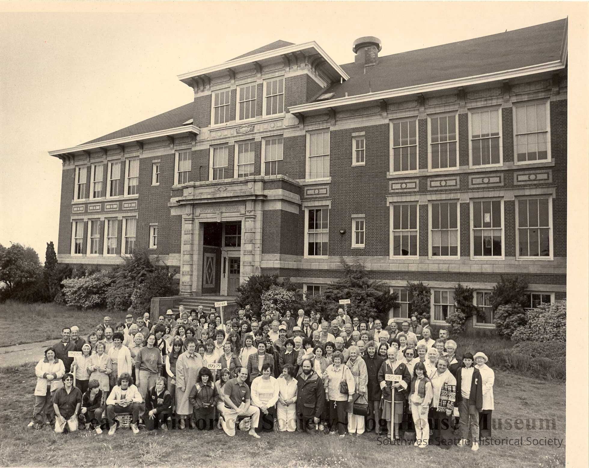 Large group of people sitting, kneeling and standing posed for photograph on lawn in front of Jefferson, school at angle behind group. Rectangular signs on poles identifying classes by decades. In folder marked "JEFFERSON SQUARE". All class reunionCollection